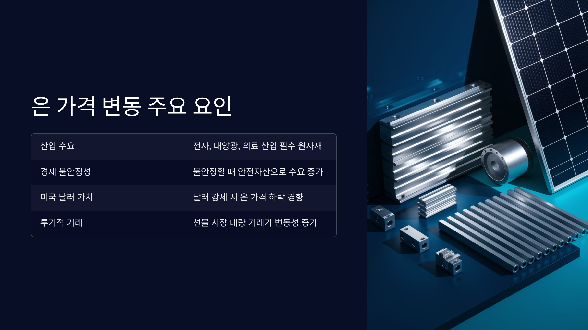 은 가격은 여러 요인에 의해 영향을 받습니다. 단순히 금 가격과 연동된다고 생각하면 오산입니다. 아래 표에서 은 가격 변동의 핵심 요인들을 정리해 보았습니다.