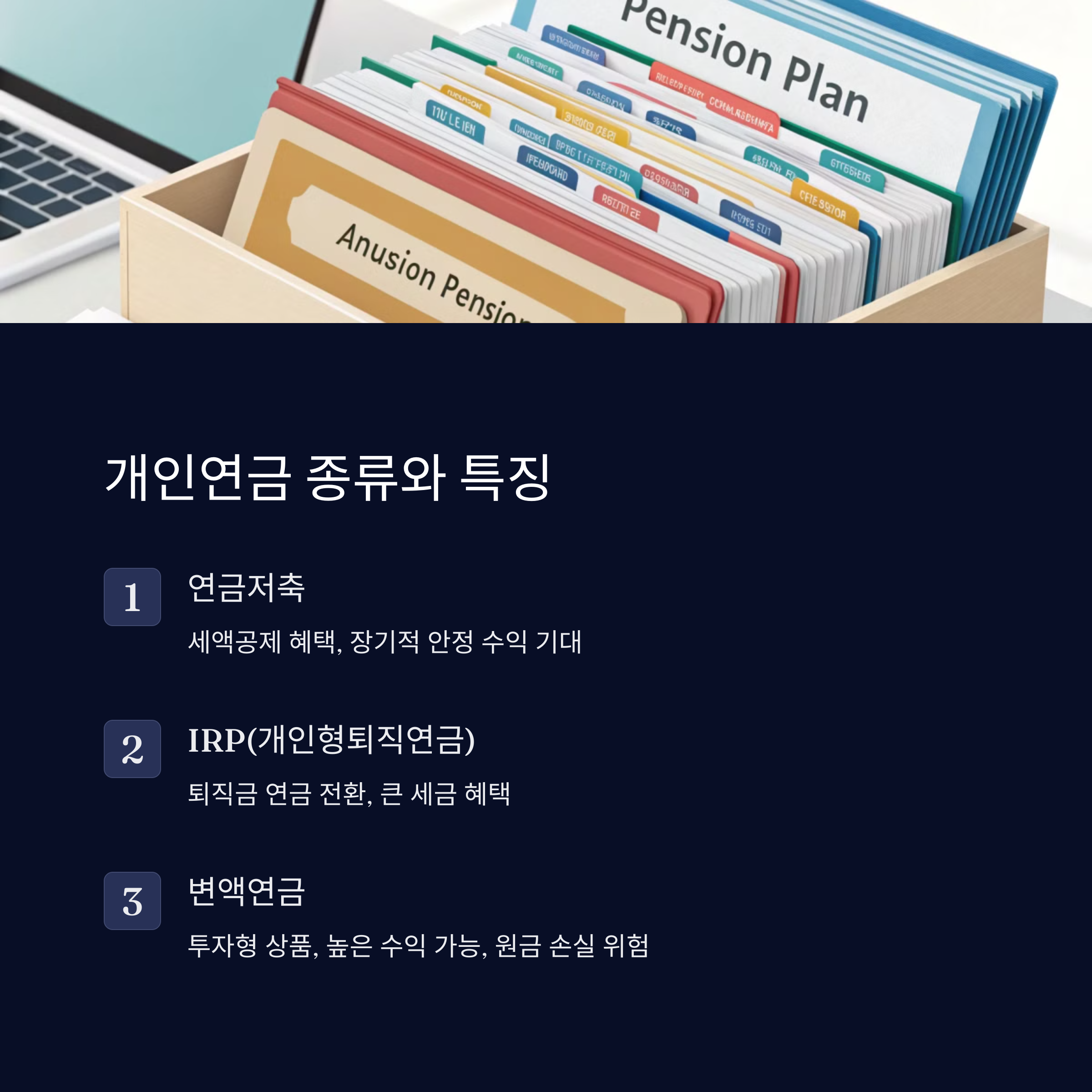 - IRP(개인형퇴직연금) - 직장인의 퇴직금을 연금으로 전환할 수 있으며, 세금 혜택이 큽니다.