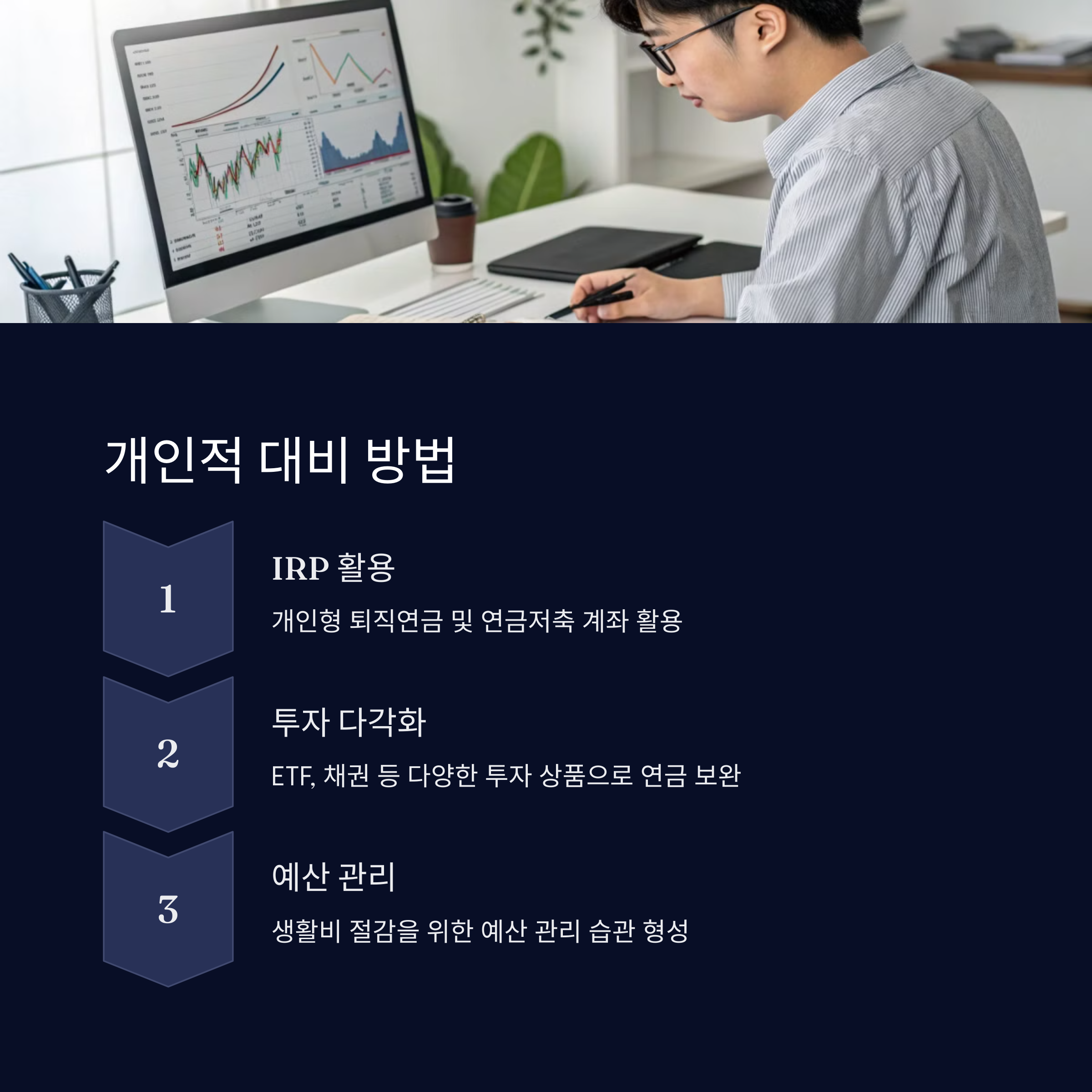 IRP(개인형 퇴직연금), 연금저축펀드, ETF 투자 등 다양한 금융 상품을 활용해 노후 대비를 준비하는 것이 중요합니다.