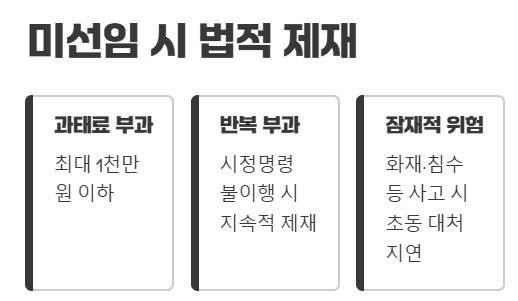 또한, 시정명령 불이행 시 과태료는 반복 부과될 수 있으며, 이는 건물 안전 관리 소홀로 인한 잠재적 위험을 증가시킬 수 있습니다.
