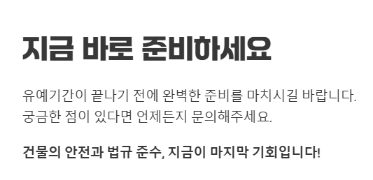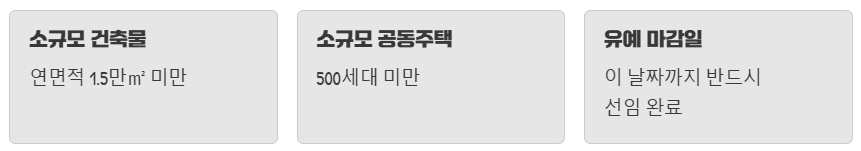 가장 최근에 많은 분들이 혼동하셨던 부분은 바로 소규모 건축물에 대한 유예기간이었을 거예요.