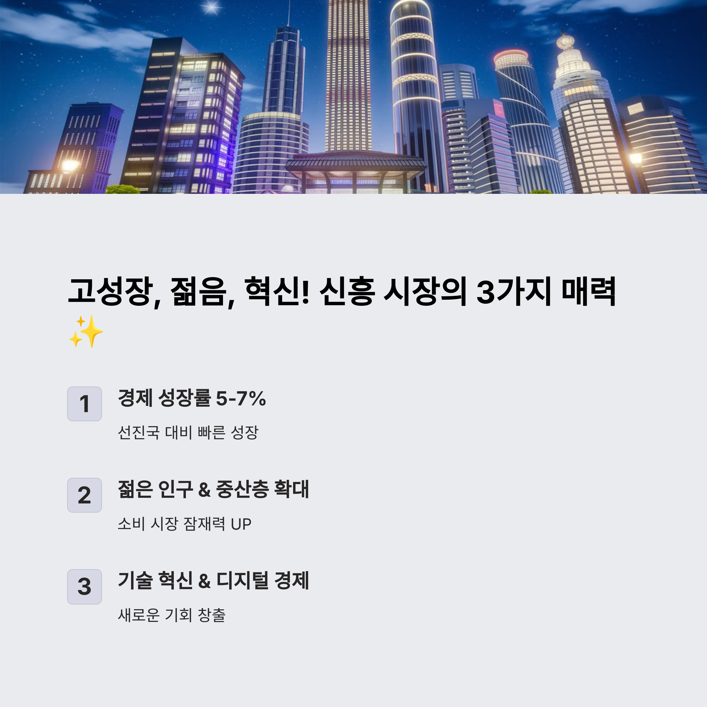 | 신흥 시장이란? | 높은 성장 가능성을 가진 개발도상국 경제를 의미합니다. |