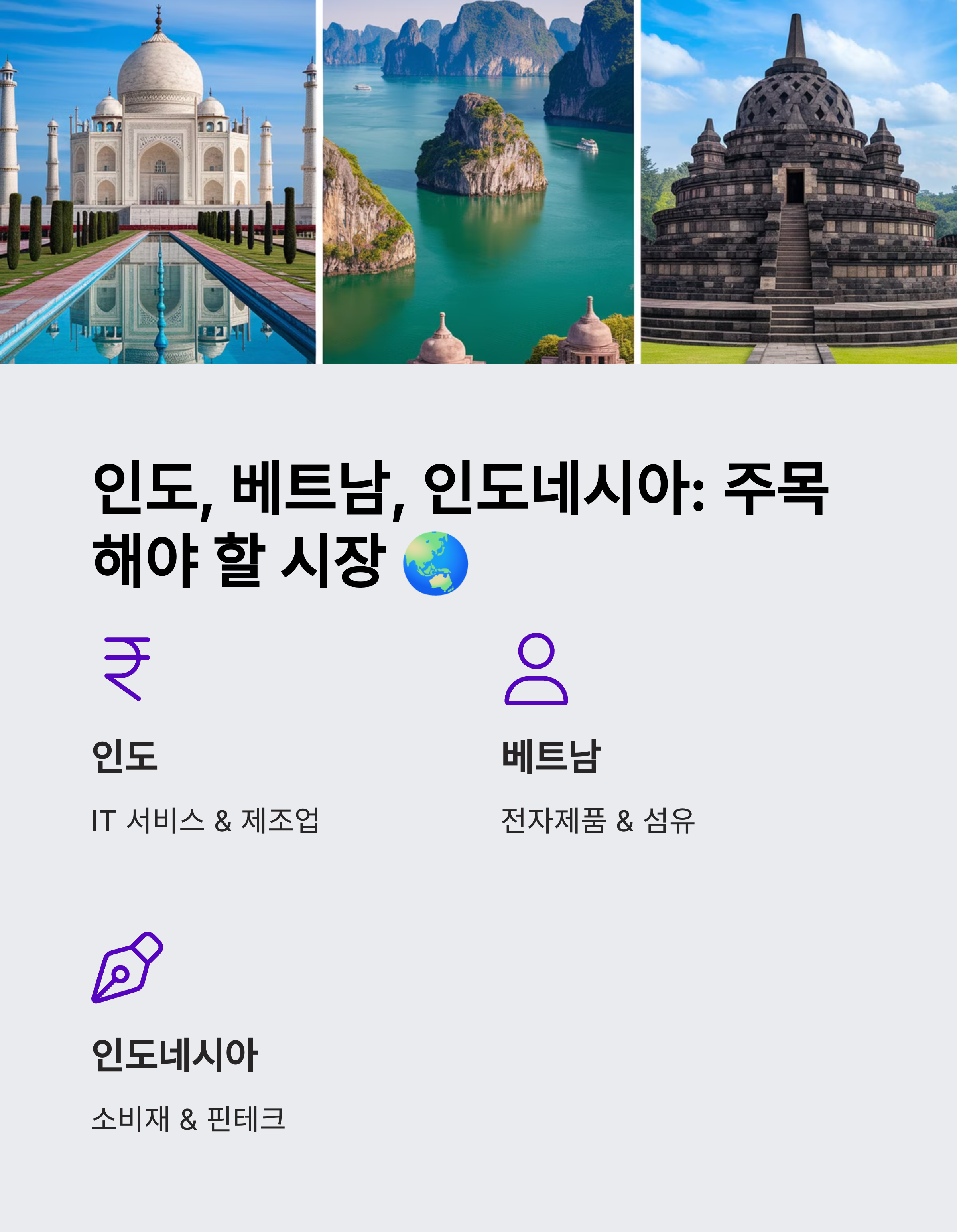 | 대표적인 신흥 시장 | 인도, 베트남, 인도네시아, 브라질, 터키 등이 포함됩니다. |
