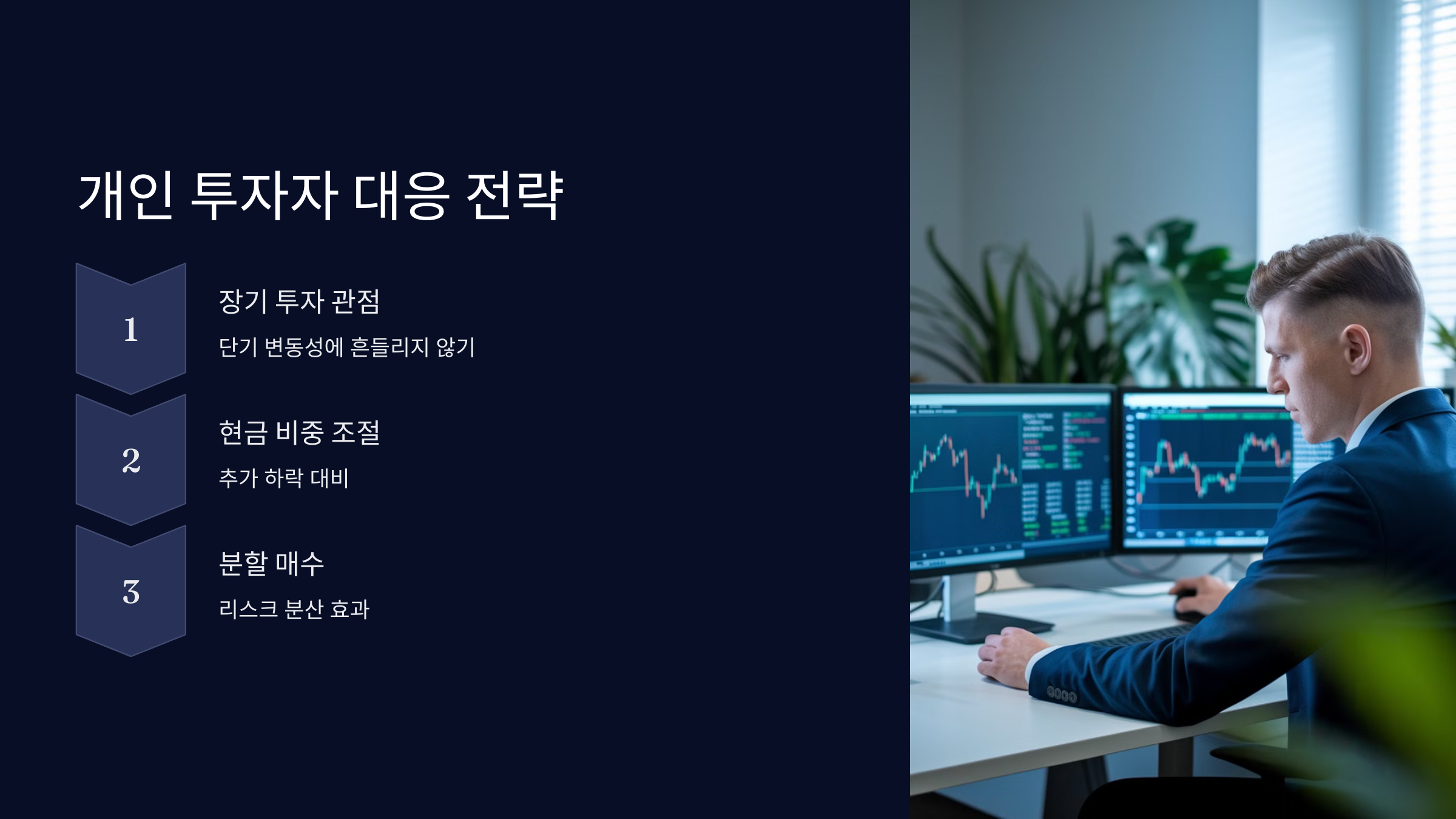 • 현금 비중 조절 - 추가 하락 가능성을 대비해 일정 부분 현금을 보유하는 것도 좋은 전략입니다.