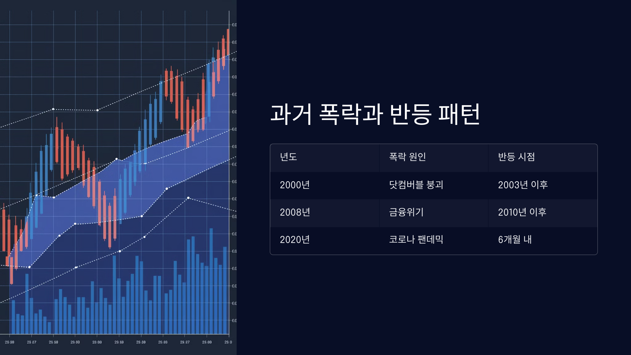 나스닥 시장의 폭락은 이번이 처음이 아닙니다. 과거에도 여러 차례 급락이 있었지만, 대부분 일정 기간 이후 반등했습니다. 다음 표는 과거 주요 폭락 사례와 반등 기간을 정리한 것입니다.