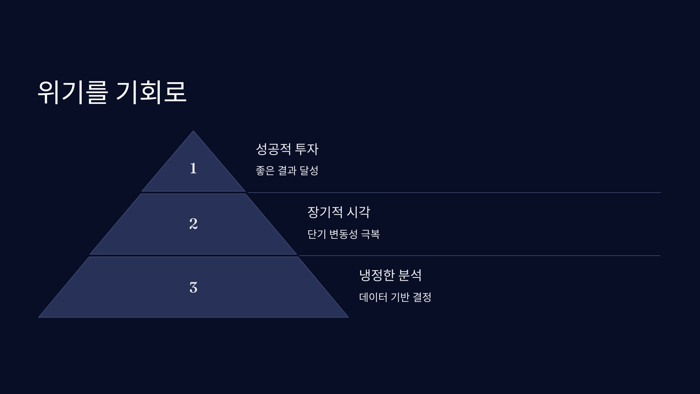 기업의 펀더멘털(재무 안정성, 시장 경쟁력)과 장기적인 성장 가능성을 고려하는 것이 중요합니다. 또한 감정적 대응을 피하고 꾸준히 투자하는 습관이 필요합니다.