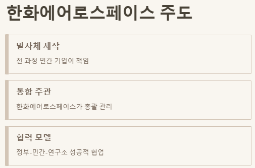 | 민간 주도 | 한화에어로스페이스 통합/주관 |