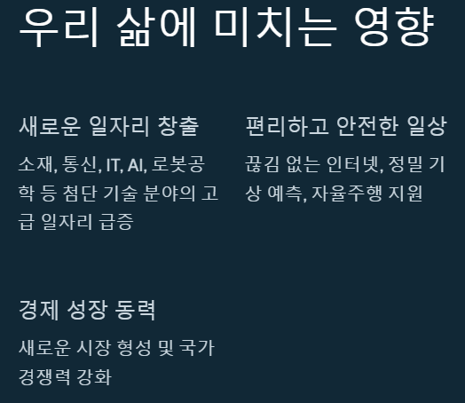 4. 개인에게 미치는 영향: 새로운 고급 일자리 창출, 위성 통신 및 데이터 활용을 통한 생활 편의 증진 등 우리 삶에 긍정적인 변화를 가져올 것입니다.