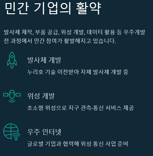 3. 민간 기업의 활약: 발사체, 위성 개발 및 데이터 활용 등 다양한 분야에서 국내 기업들이 적극적으로 참여하며 우주산업을 이끌고 있습니다.