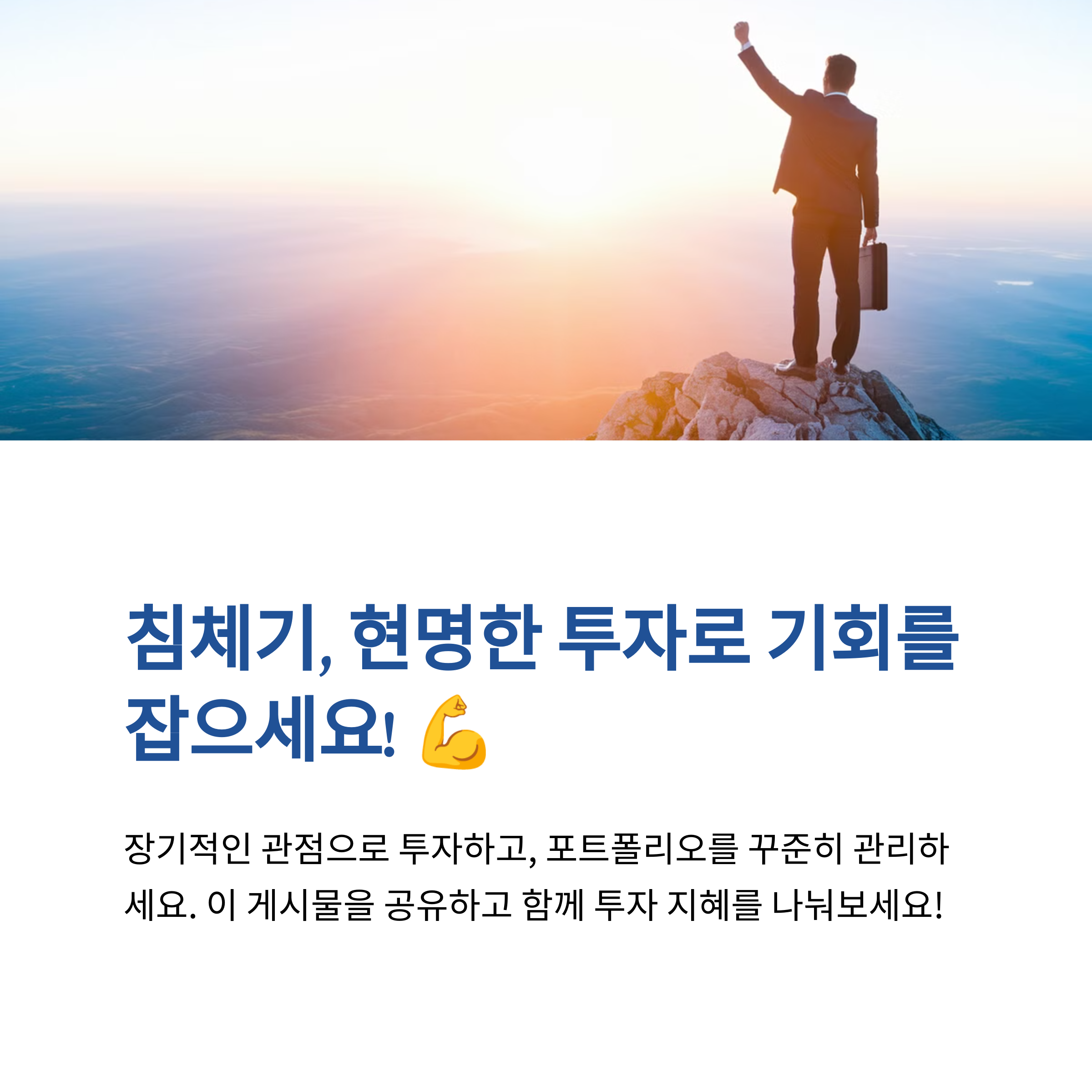경기침체는 투자자들에게 도전적인 시기일 수 있지만, 동시에 새로운 기회의 문을 열어줄 수도 있습니다. 중요한 것은 위험을 관리하면서도 성장 가능성이 있는 투자처를 찾는 것입니다. 안정적인 자산과 성장 산업을 적절히 조합하고, 분산 투자를 통해 포트폴리오를 견고하게 구축한다면 어떤 경제 상황에서도 흔들리지 않는 투자를 할 수 있을 것입니다.