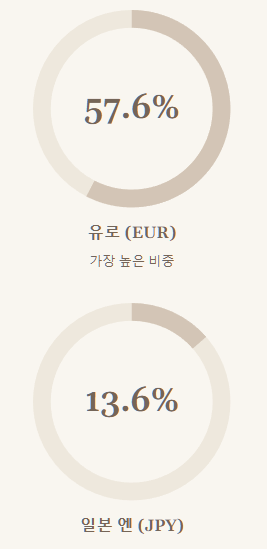 - 유로(EUR): 57.6% - 가장 높은 비중을 차지해요. 유럽 경제의 규모와 영향력을 엿볼 수 있죠.