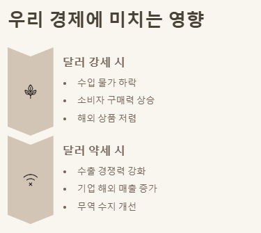 • 달러 강세 시: 수입 물가가 하락하고, 우리 소비자들이 해외 상품을 더 저렴하게 살 수 있어 구매력이 상승합니다.