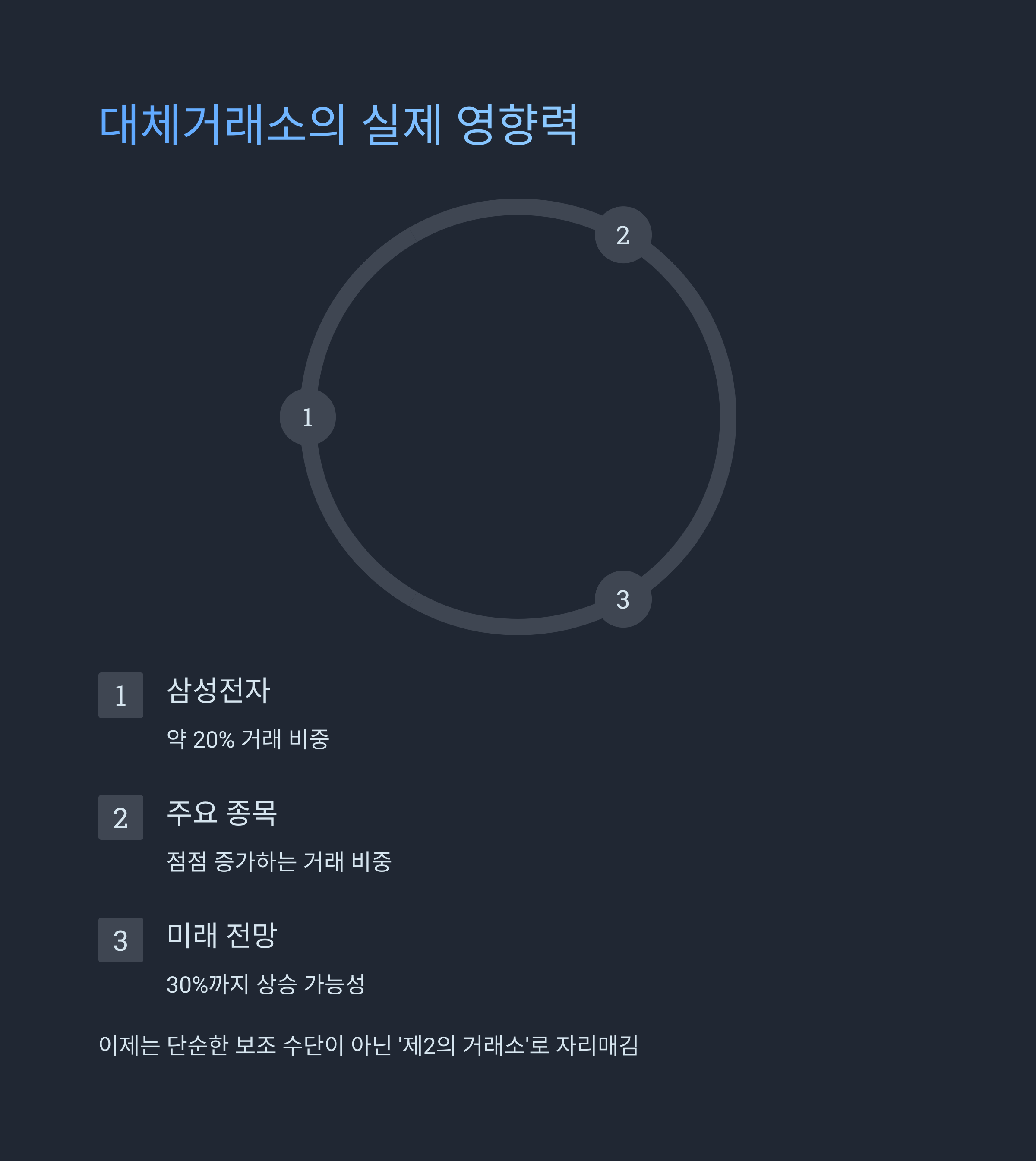 삼성전자처럼 거래량이 많은 종목에서도 20% 가까운 거래가 대체거래소에서 이뤄지는 걸 보면, 이건 단순히 보조적인 수단이 아니라 진짜 ‘제2의 거래소’가 된 거예요.