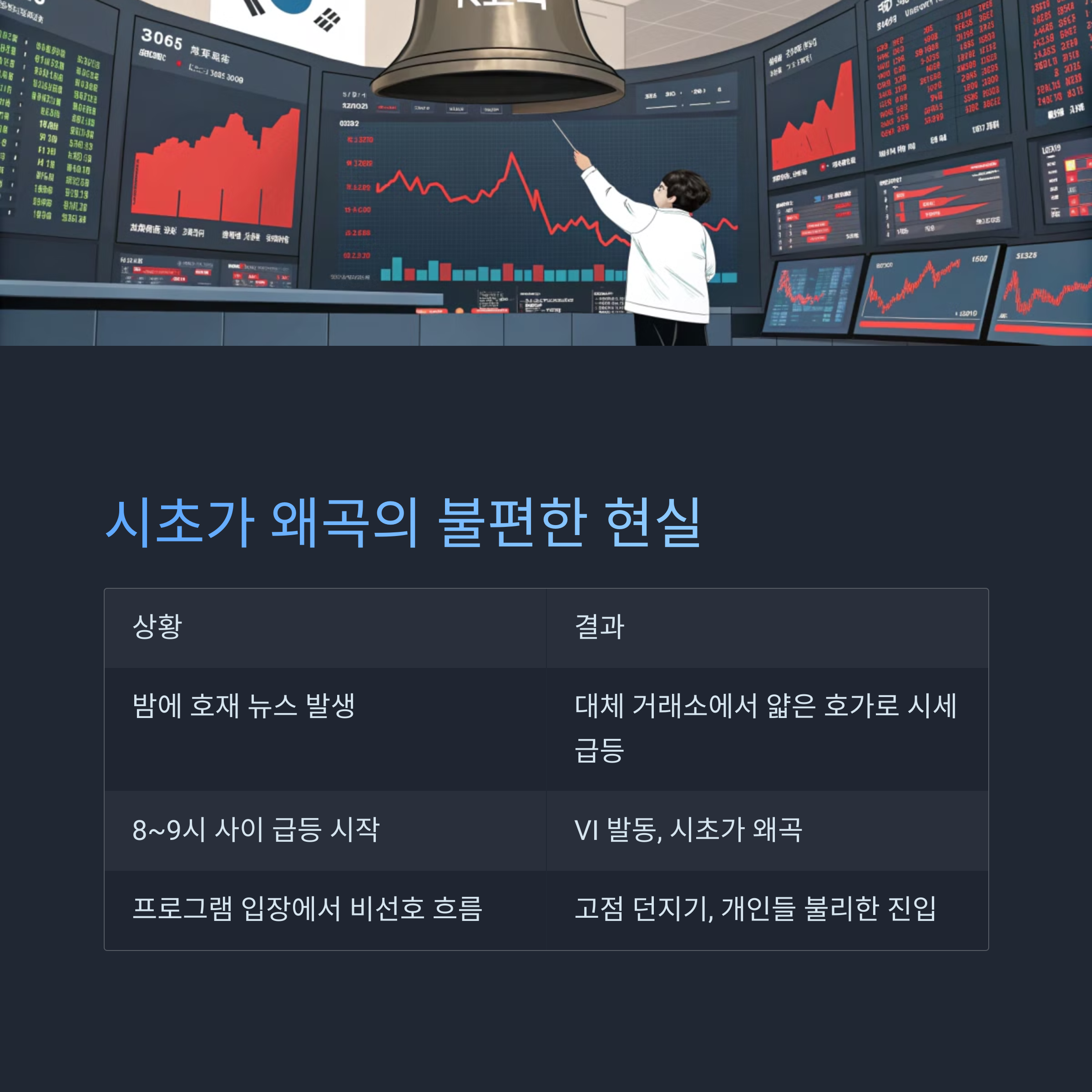 | 시장 영향력 | 시세 형성과 흐름 주도 | 가격 왜곡 및 시초가 혼란 유발 |