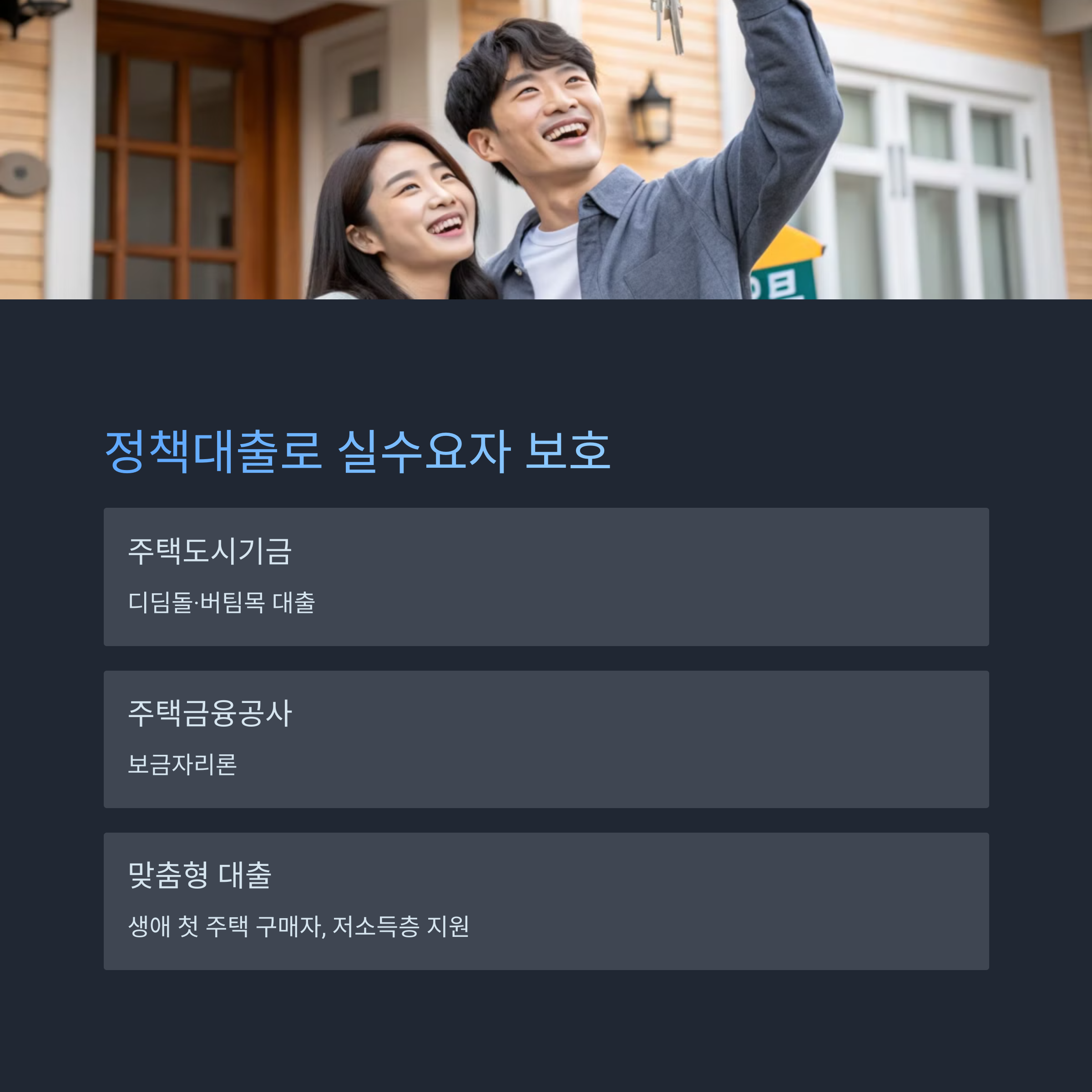 이러한 대출은 일반 시중 대출보다 완화된 조건으로 제공되어 실수요자들의 주택 구매를 돕습니다.