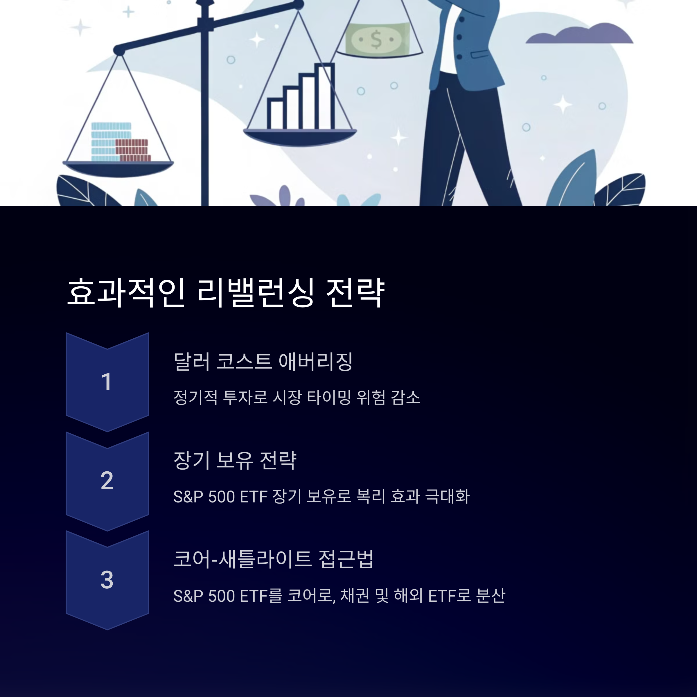 • 코어-새틀라이트 접근법: S&P 500 ETF를 코어로 두고, 채권 및 해외 ETF로 분산 투자합니다.