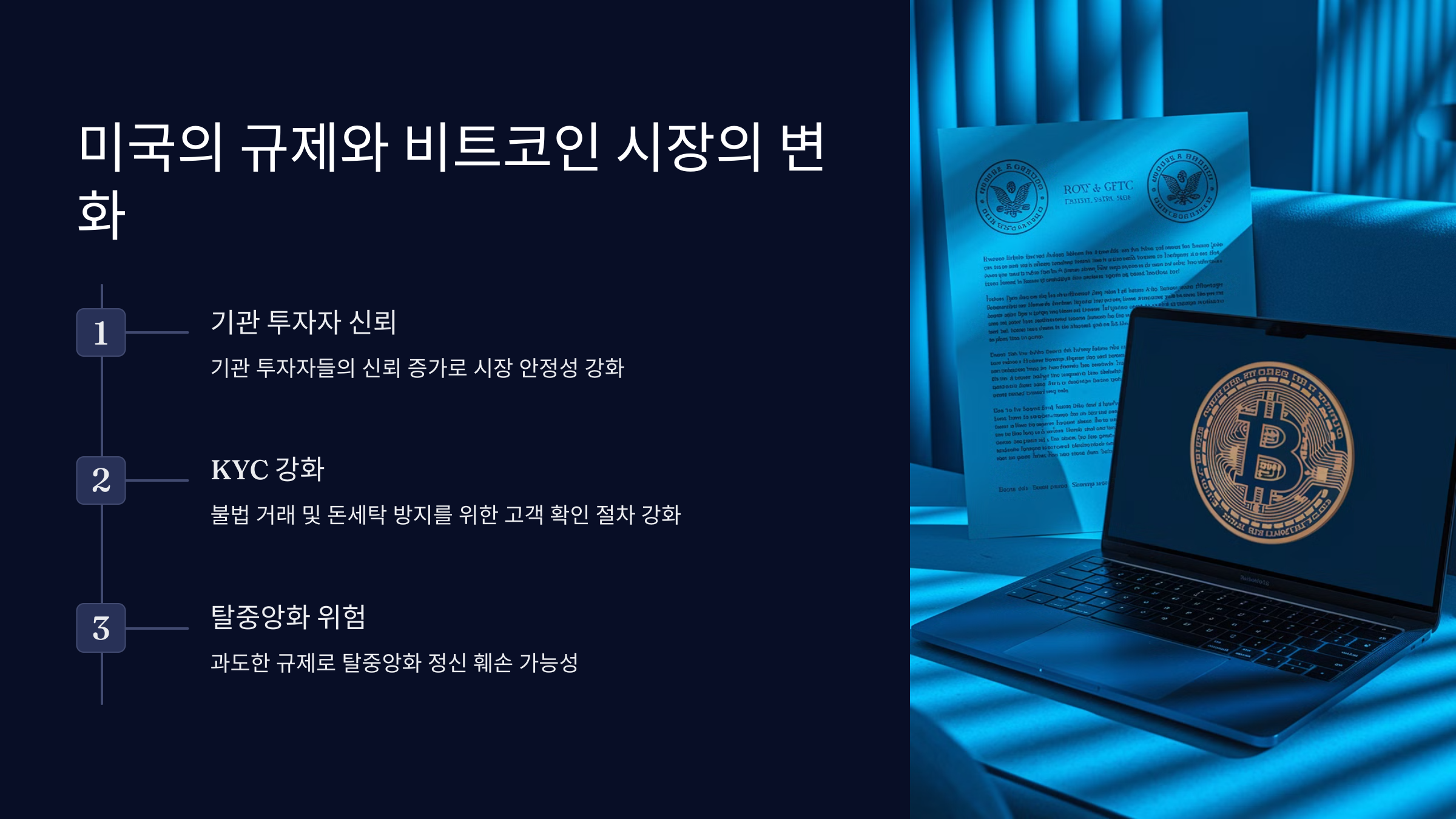 그렇다면, 미국의 규제는 비트코인 시장에 어떤 영향을 미칠까요? 아래는 그 핵심 내용을 정리한 리스트입니다.