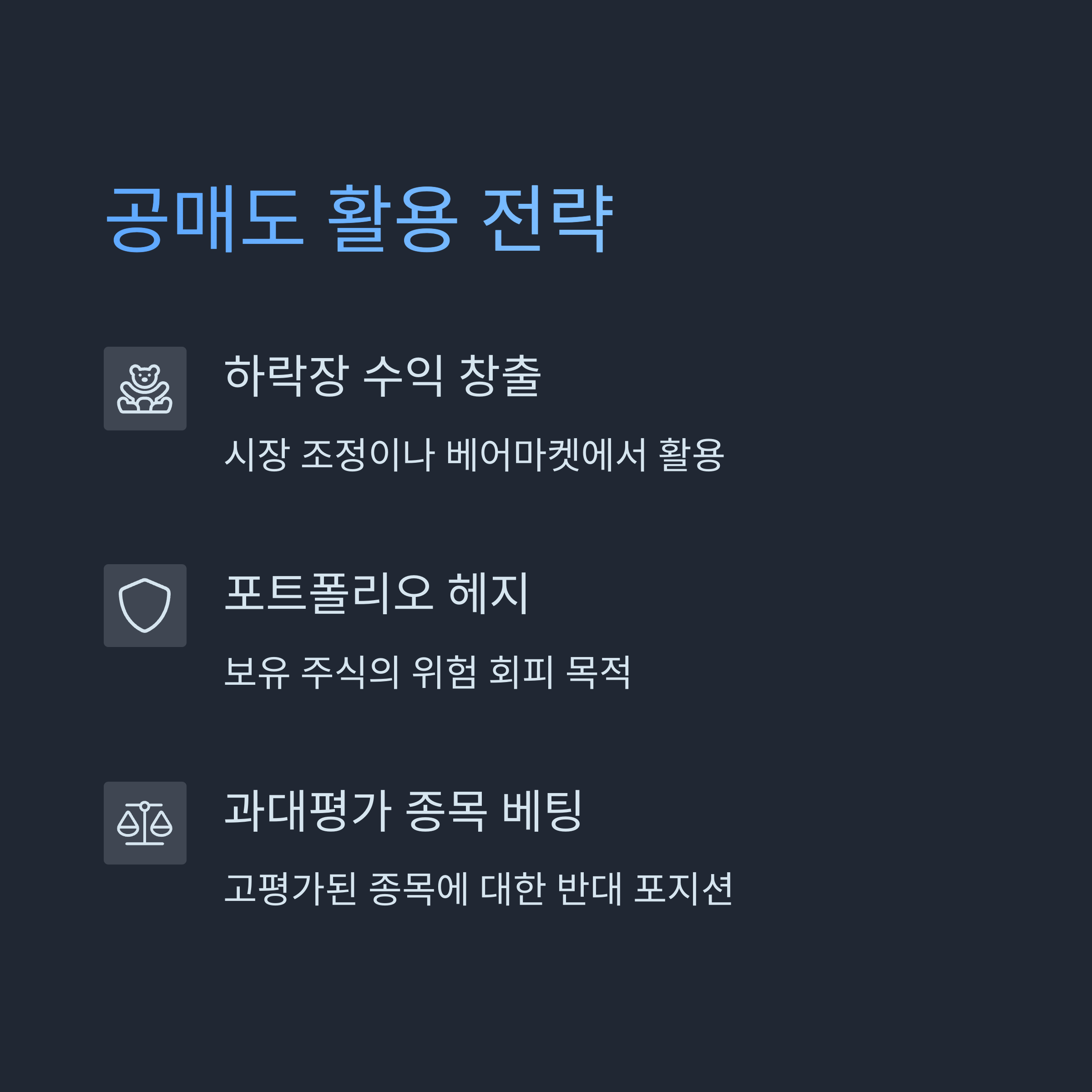 - 하락장에서 수익 창출 (시장 조정 또는 베어마켓 대응)