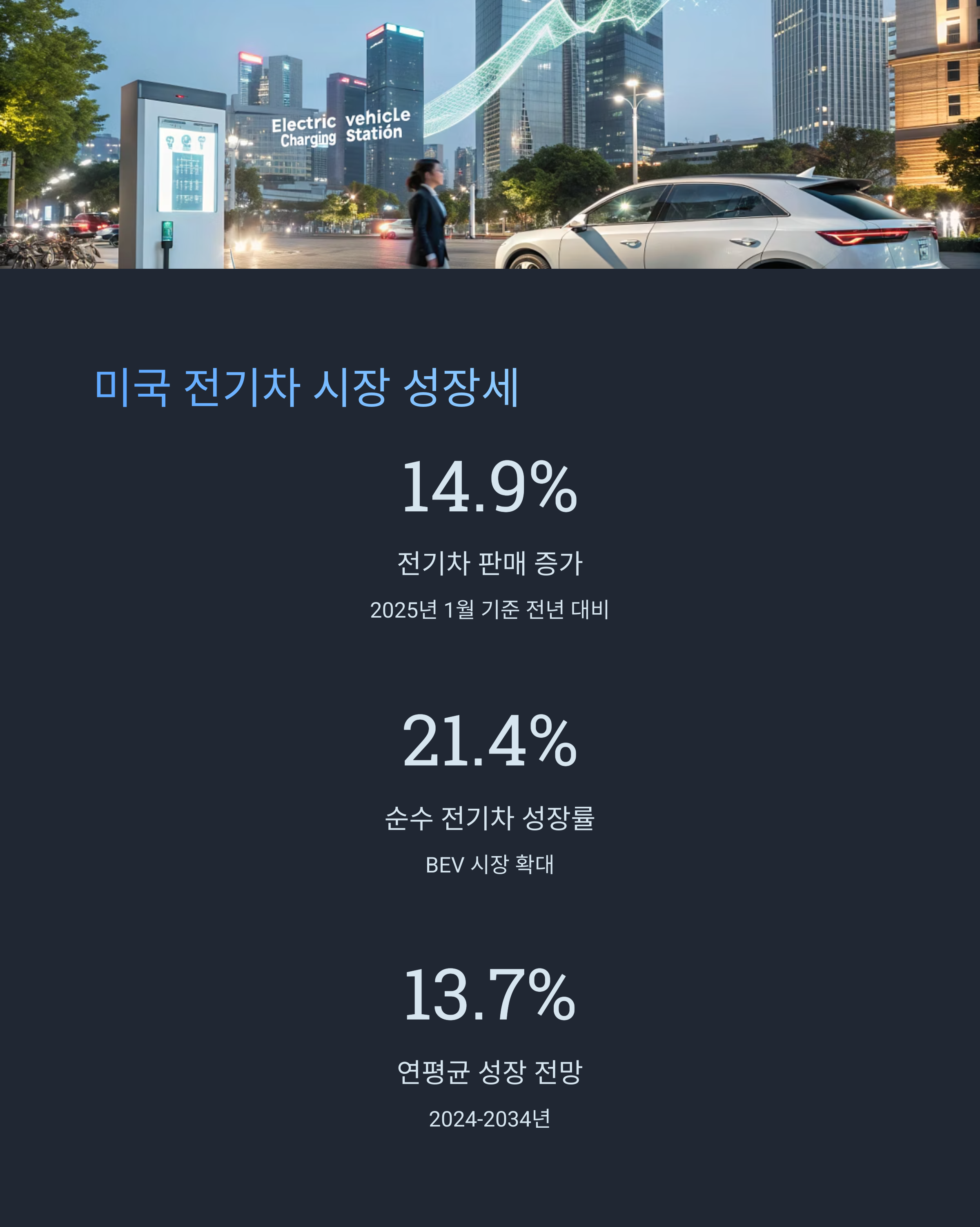2025년 1월 기준 전기차 판매량은 전년 대비 14.9% 증가했고, 이 중 순수 전기차(BEV)는 21.4%나 성장했습니다.