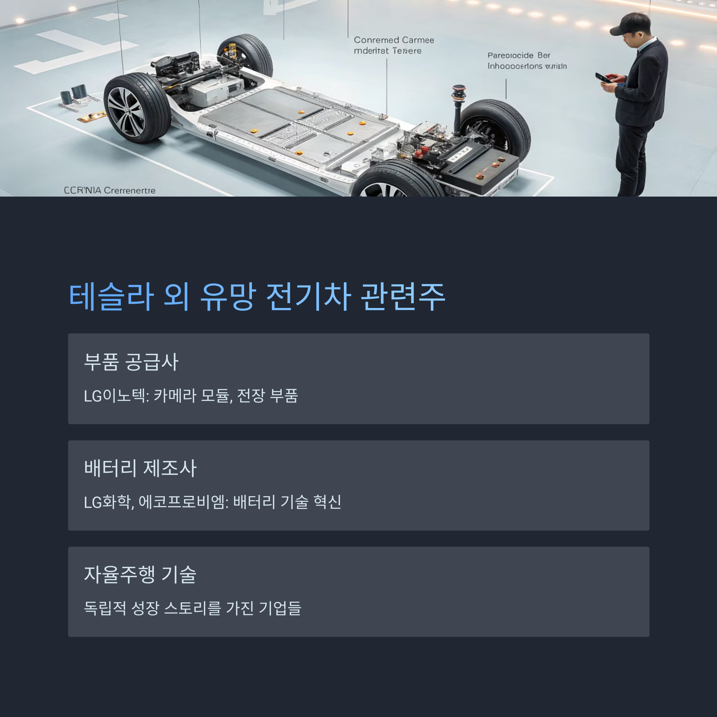부품을 공급하거나, 배터리를 생산하거나, 자율주행 시스템을 개발하는 기업들이죠.