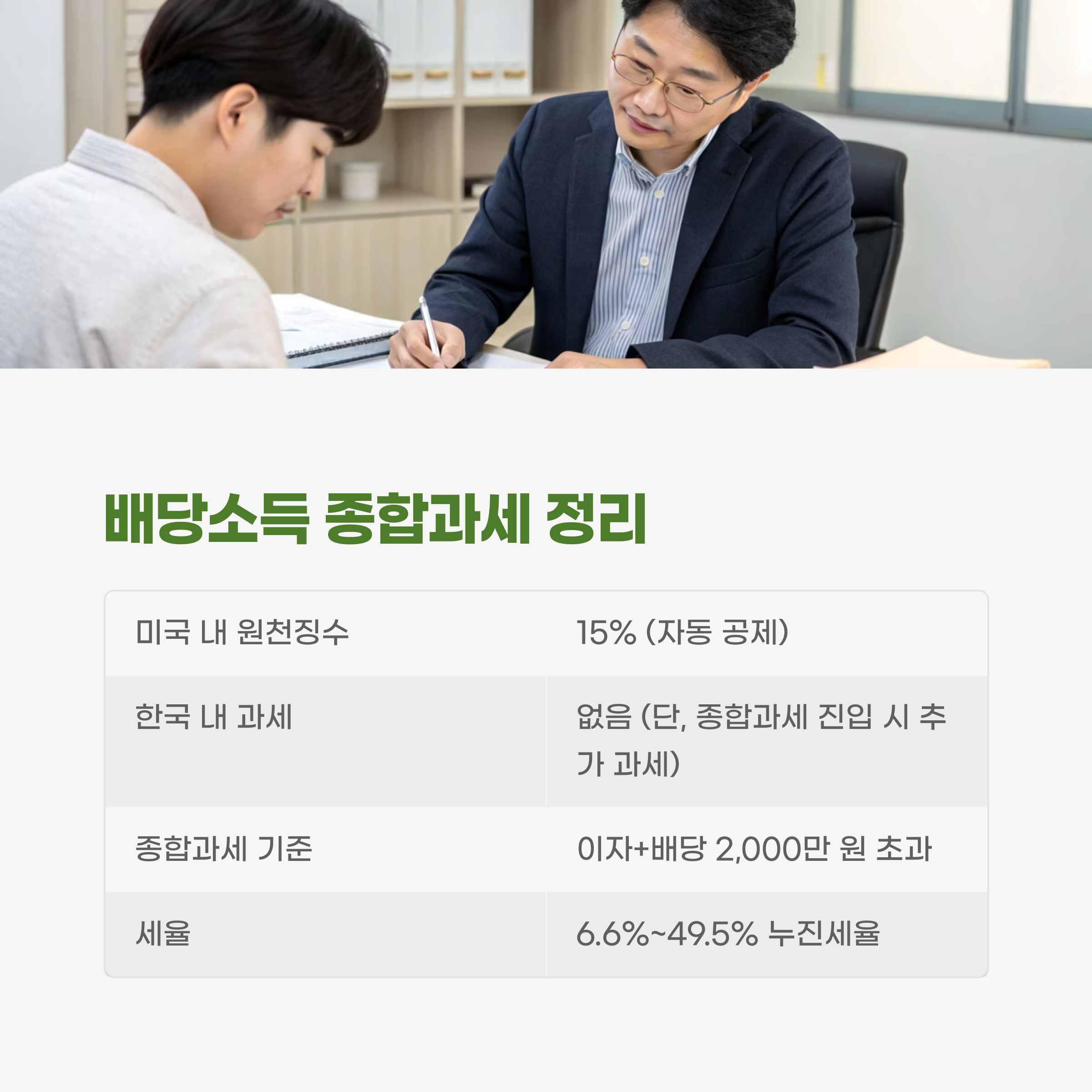 미국에서 15% 원천징수가 이미 되기 때문에, 일반적으로 한국에서 추가 세금은 없습니다. 단, 금융소득이 연 2천만 원을 넘을 경우 종합과세 대상이 됩니다.