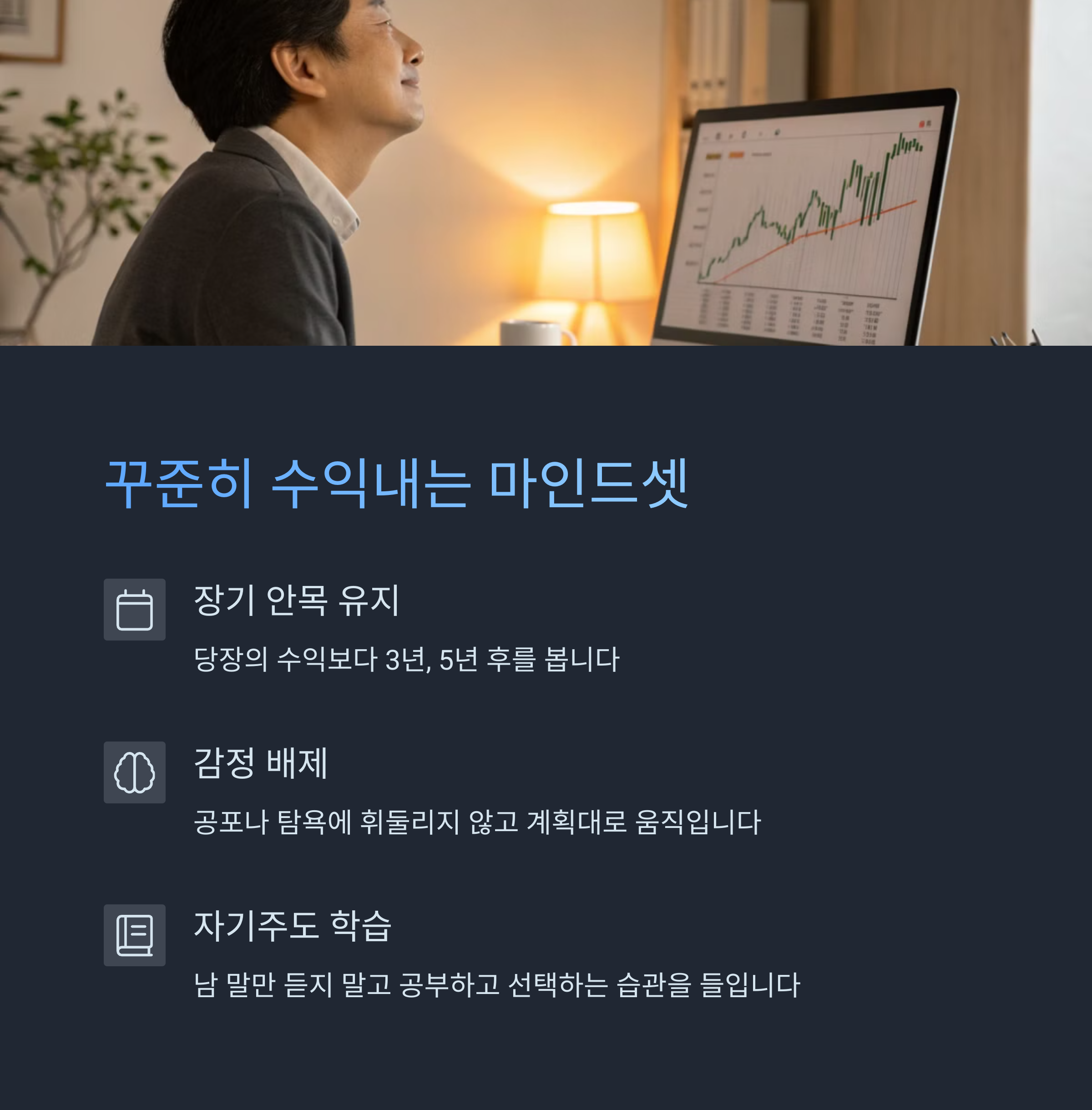 - 장기 안목 유지: 당장의 수익보다 3년, 5년 후를 본다