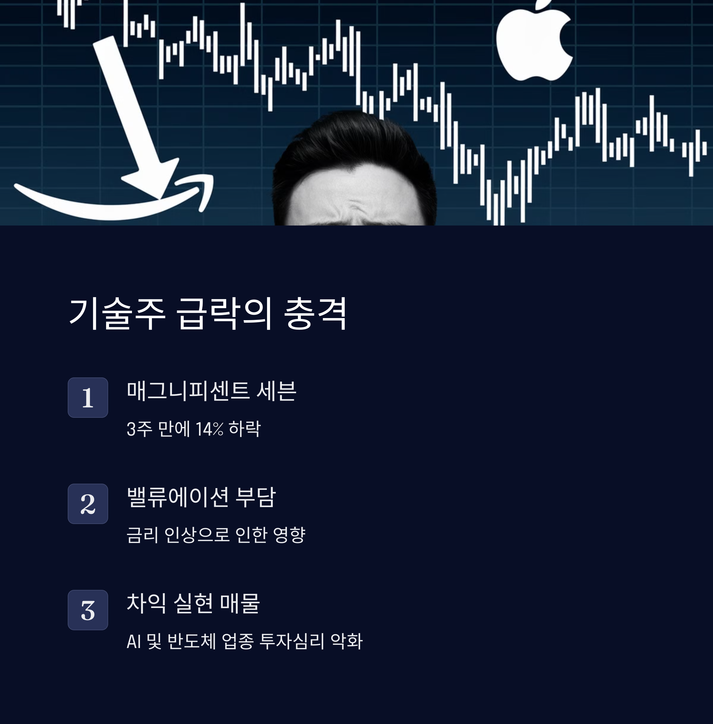 특히 ‘매그니피센트 세븐(Magnificent Seven)’이라 불리는 주요 기술주(아마존, 애플, 메타, 엔비디아, 테슬라 등)가 3주 만에 14% 하락하며 시장 전반에 충격을 주었습니다.