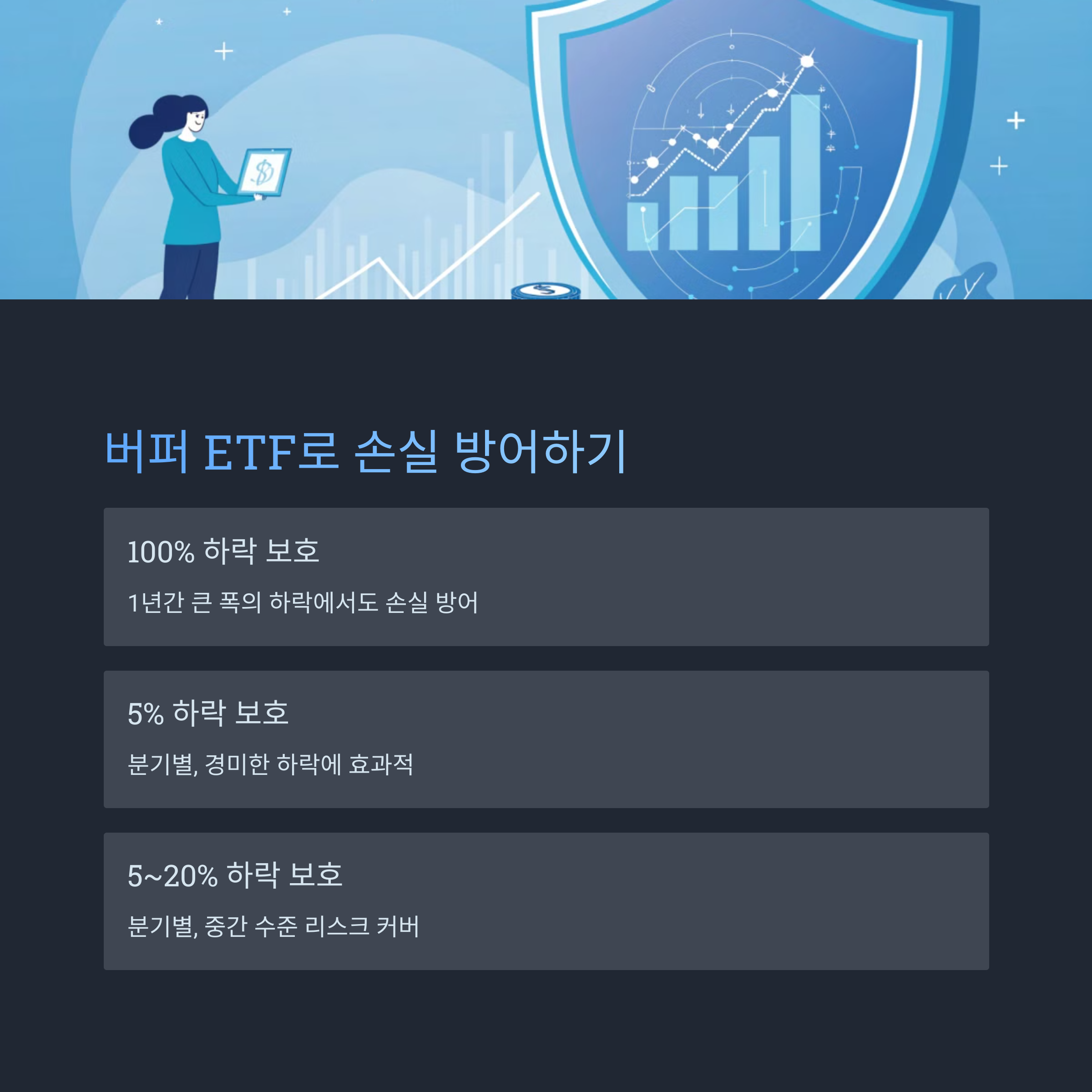 버퍼 ETF는 특정 수준의 하락 손실을 사전에 방어하는 구조로 설계돼 있으며, 그 대가로 상승 수익은 일정 수준으로 제한됩니다. 시장 변동성이 클 때 유리하죠.