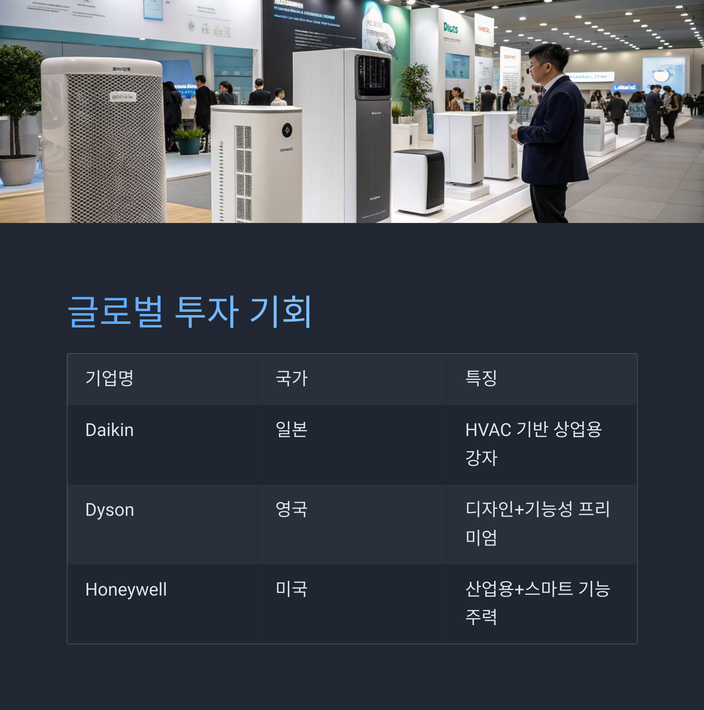 특히 Daikin, Dyson, IQAir, Honeywell 같은 기업들은 글로벌 공기청정기 시장에서 높은 존재감을 자랑하죠.