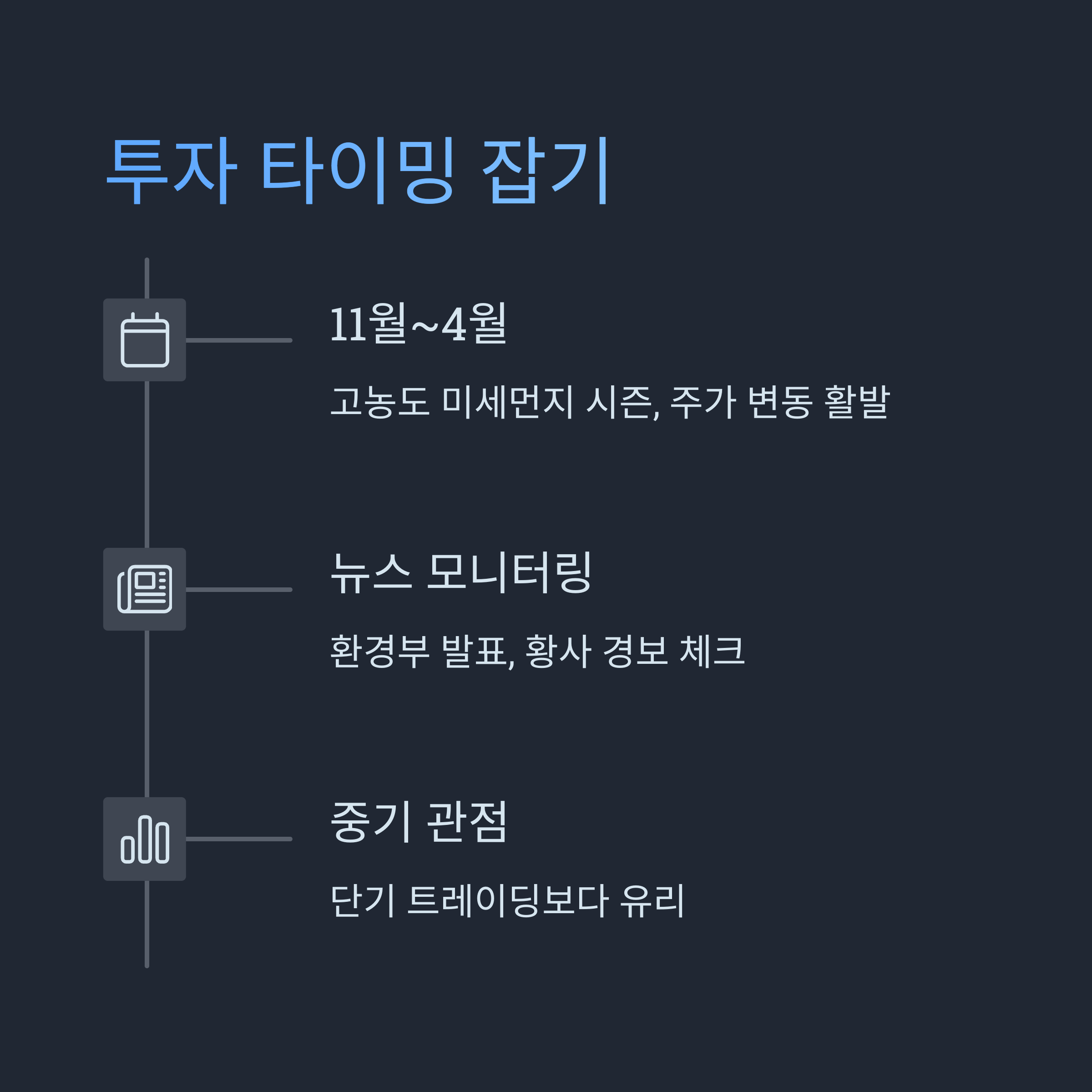 일반적으로 11월부터 4월 사이, 미세먼지 농도가 높아질 시기를 중심으로 매수 기회를 노리는 것이 효과적입니다. 기상청 예보와 환경부 발표를 주기적으로 확인하세요.