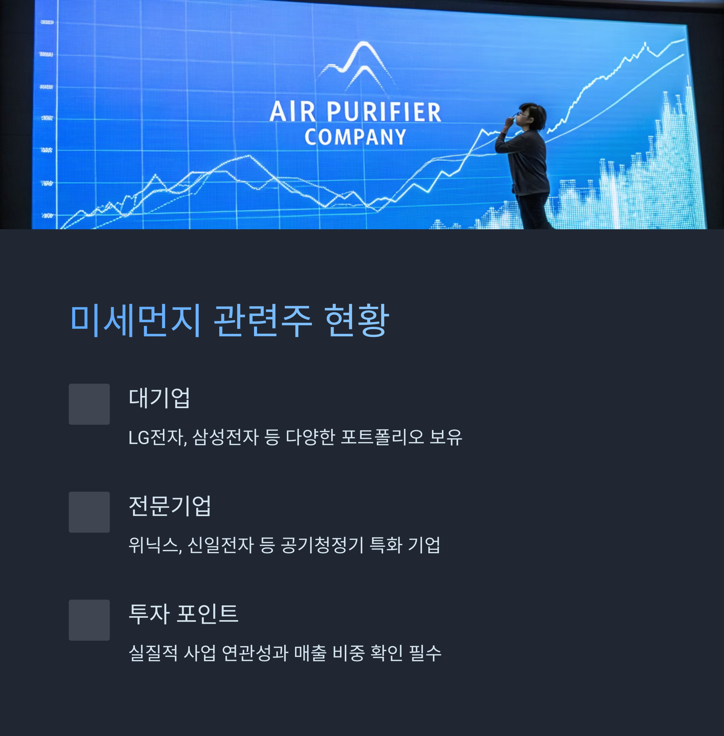 특히 공기청정기, 필터 제조사, 환경 모니터링 기업 등이 '미세먼지 관련주'로 분류되며 시장에서 주목받고 있죠.