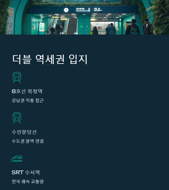 - 압도적인 입지: 지하철 8호선·수인분당선 복정역 더블 역세권, SRT 수서역 인접으로 서울 및 전국으로의 쾌속 교통망 확보.