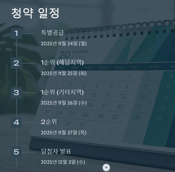 가장 중요한 청약 일정을 빼놓을 수 없죠? 2025년 11월 14일 매일경제에 입주자모집공고가 게시되었고, 드디어 코앞으로 다가온 청약 접수일이 제 마음을 더욱 두근거리게 만드네요. 여러분도 달력에 꼭 표시해 두셔야 할 겁니다!