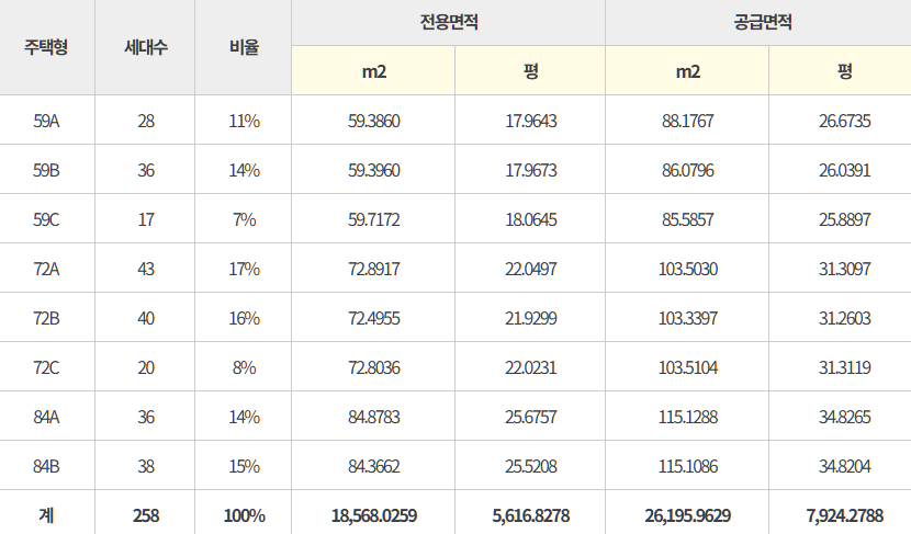 이번 공급은 총 143세대 규모로, 실수요자들에게 인기 많은 중소형 평형대로 구성되어 있어요. 59㎡, 72㎡, 84㎡ 세 가지 타입이 준비되어 있습니다.