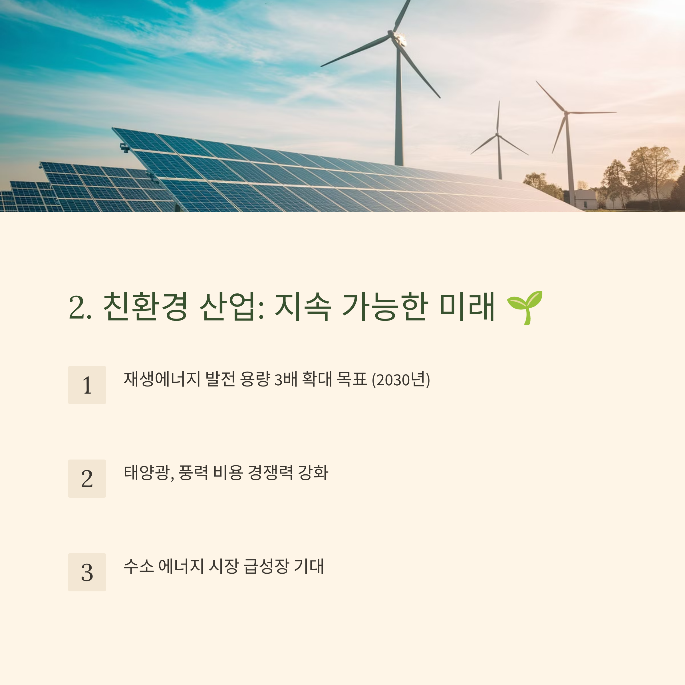 | 친환경 산업 | 지속 가능한 미래를 위한 친환경 기술과 에너지가 급부상합니다. |