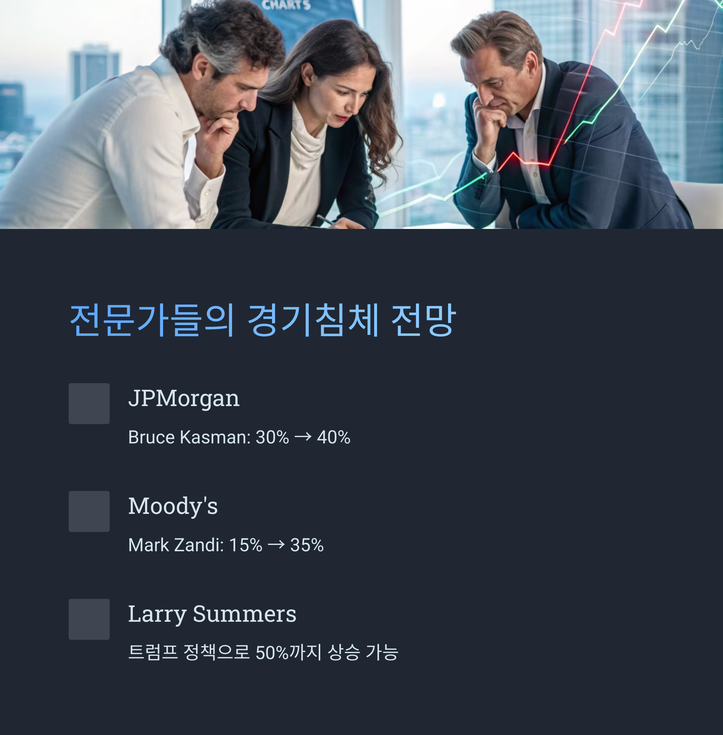 가장 눈에 띄는 건 전 재무장관 Larry Summers인데, 트럼프 정책들을 이유로 50%까지 갈 수 있다고 경고했죠.