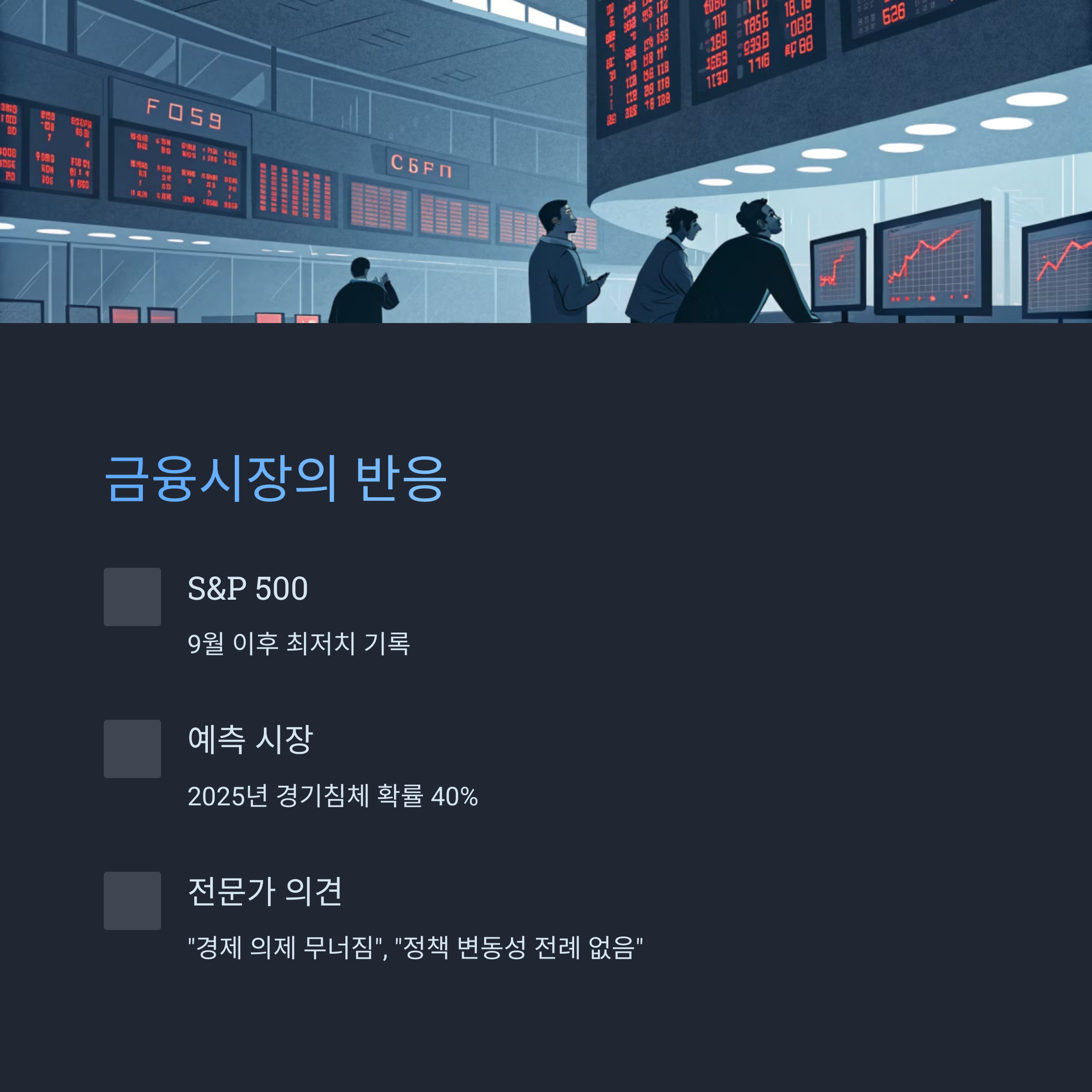 최근 S&P 500 지수가 9월 이후 최저치를 찍었고, 예측 시장에서는 2025년 경기침체 확률을 40%로 보고 있어요.