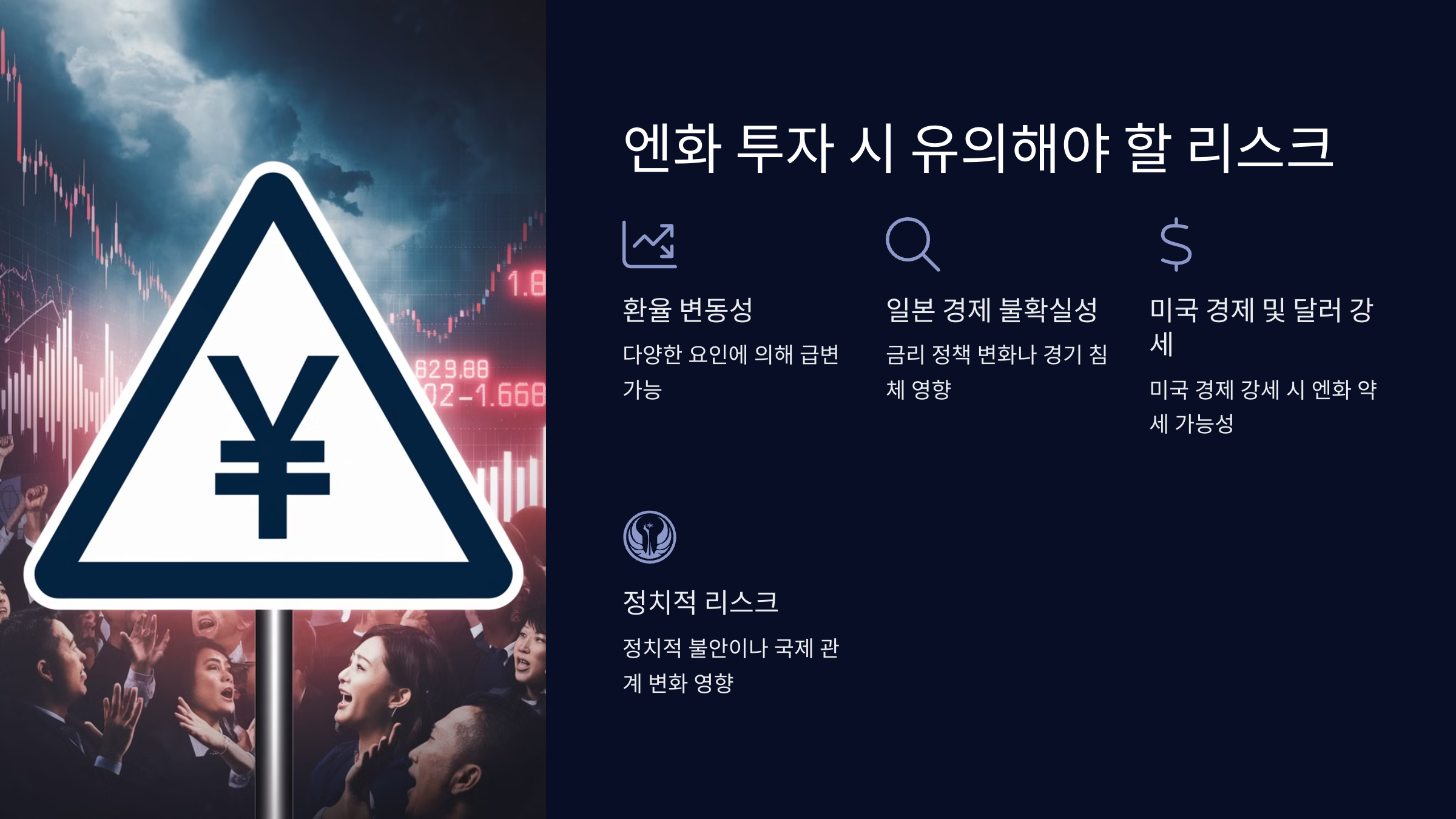엔화 강세가 기회처럼 보일 수 있지만, 모든 투자는 리스크를 동반합니다. 특히 환율 변동성이 높은 외환 시장에서는 예상치 못한 손실을 입을 가능성이 있습니다. 주요 리스크를 살펴보겠습니다.