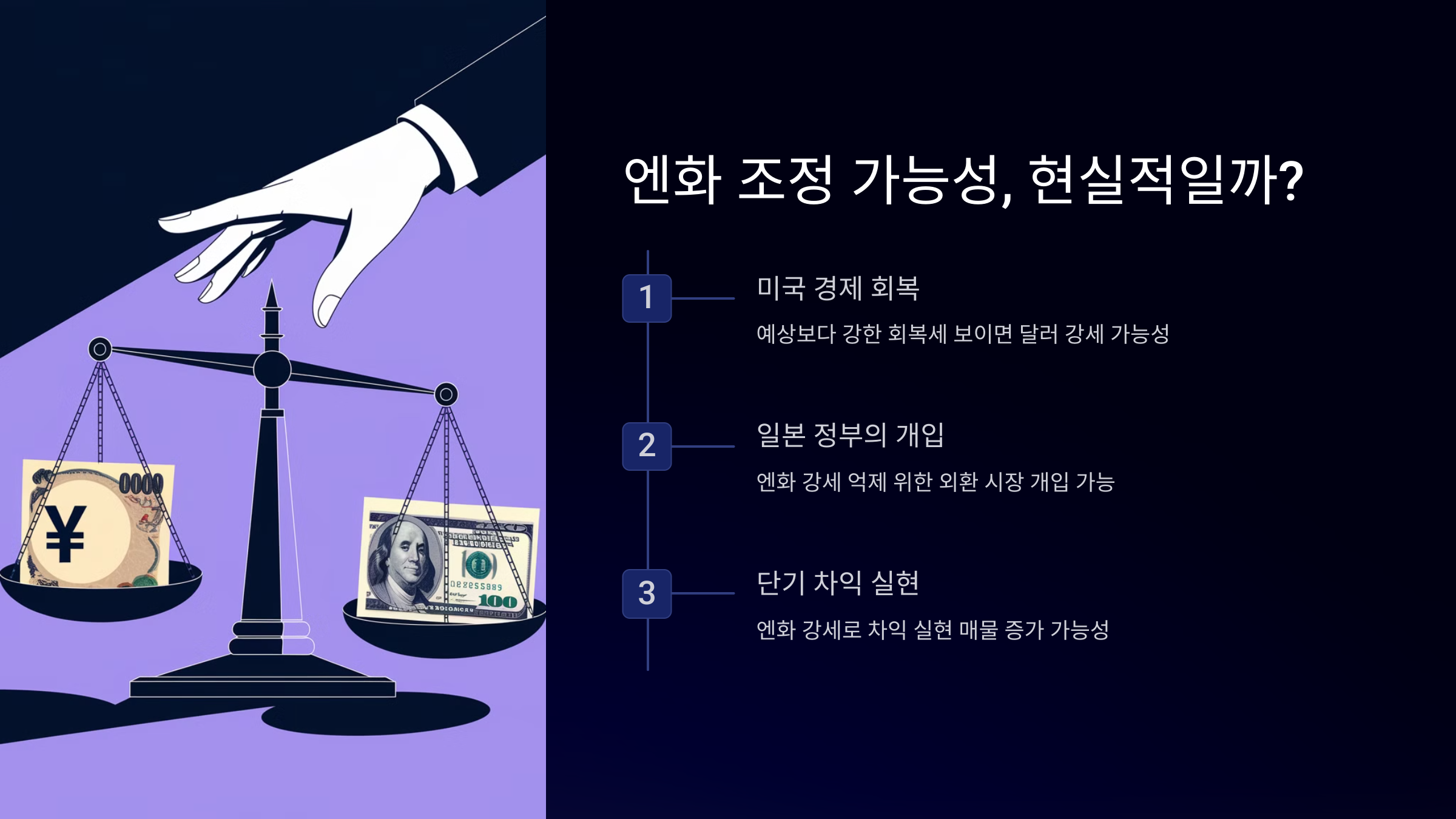 - **엔화 약세 반전 가능성** - 일본 정부 개입 시 강세 흐름이 꺾일 가능성도 있음