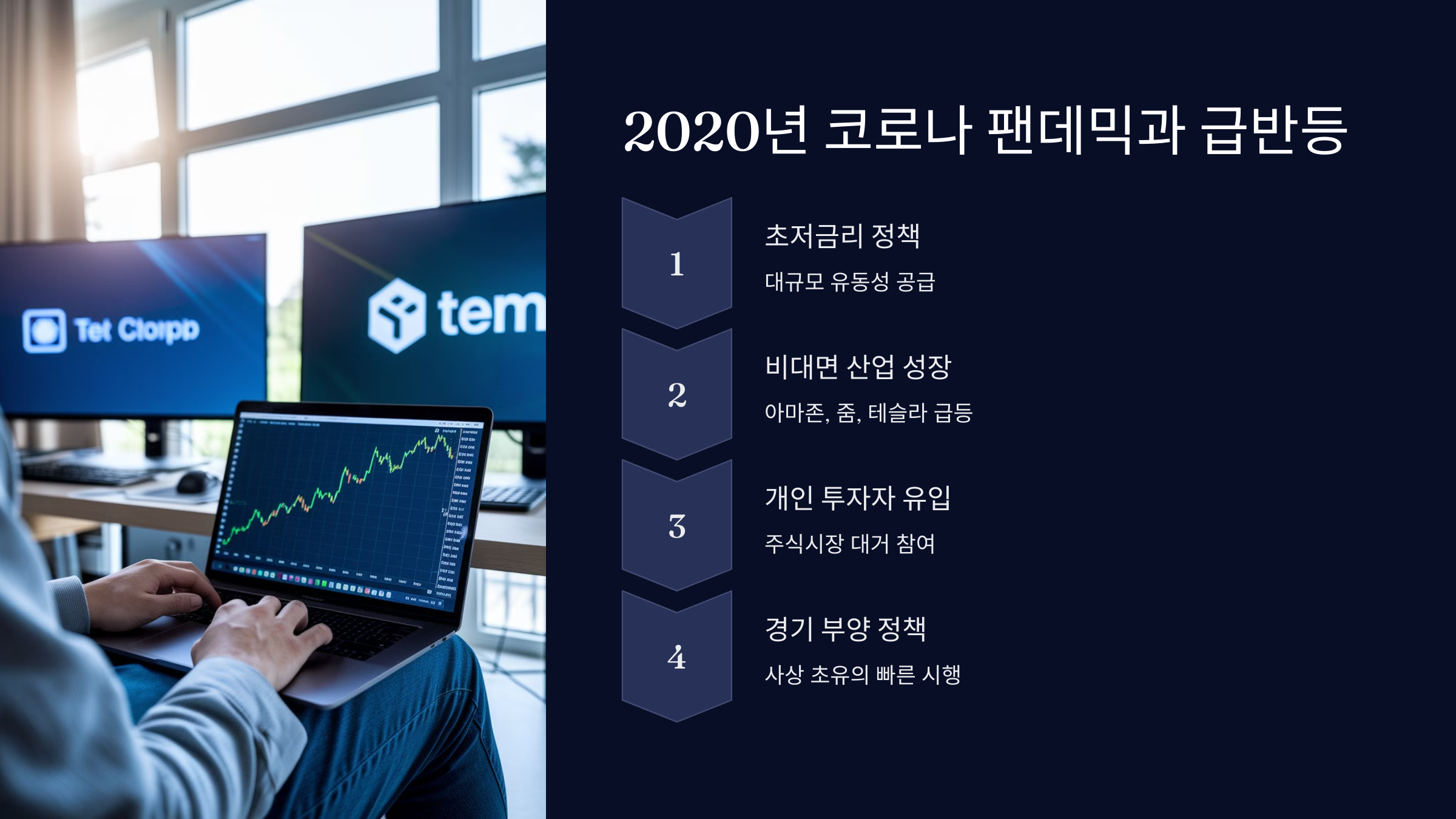 2020년 초, 코로나19 팬데믹이 발생하며 세계 경제가 멈춰섰고, 나스닥도 급락했습니다. 하지만 이번에는 이전과 다르게 유례없는 속도로 반등했는데요. 그 이유는 다음과 같습니다.