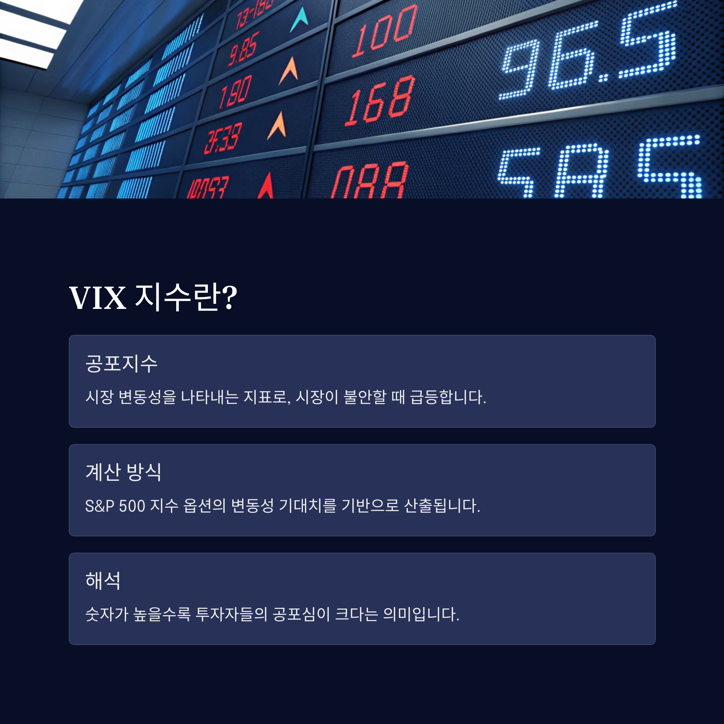 VIX 지수는 S&P 500 지수 옵션의 변동성 기대치를 기반으로 계산되며, 숫자가 높을수록 투자자들의 공포심이 크다는 의미로 해석됩니다.