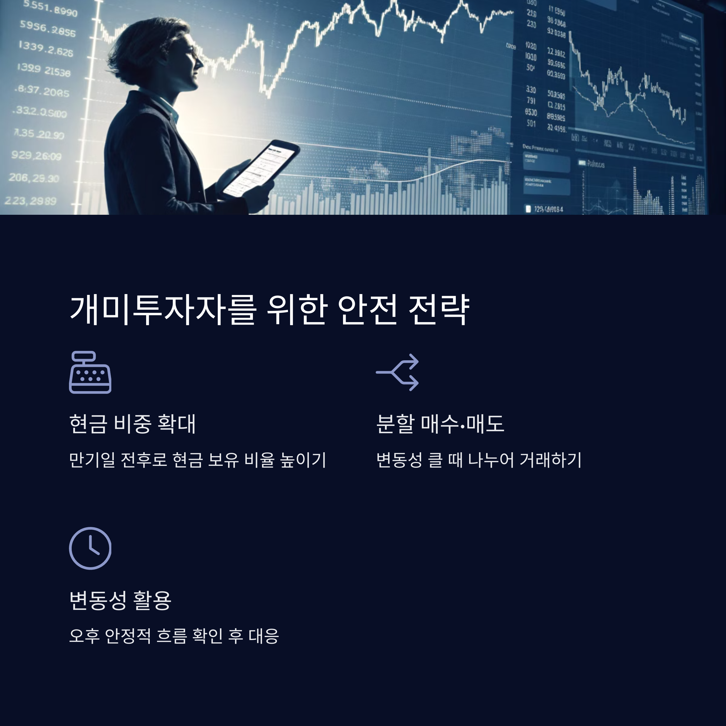 옵션만기일에 변동성이 크다는 것을 알았다고 해서 무조건 피할 필요는 없습니다. 대신 리스크를 최소화하면서도 기회를 잡을 수 있는 안전한 투자 전략을 고려해야 합니다.