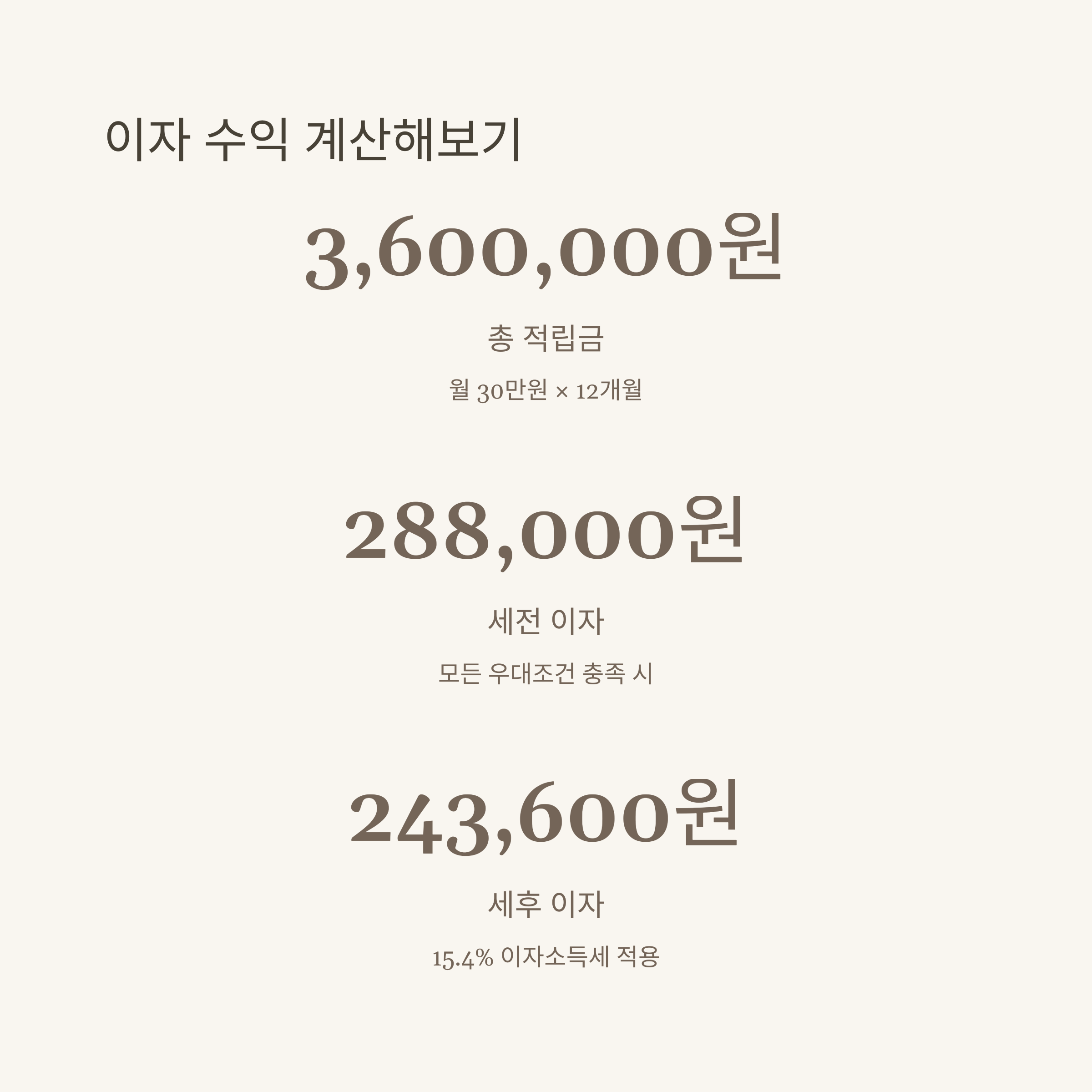 | 예상 세후 이자 | 약 243,600원 | 15.4% 이자소득세 적용 |