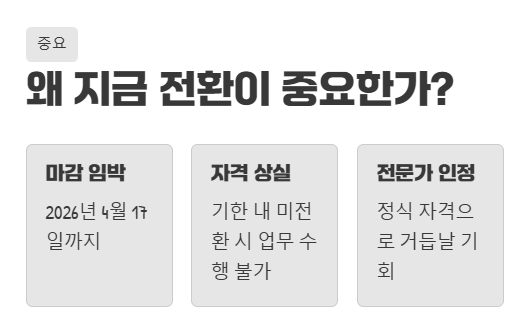 ⚠️ 경고: 전환 기한을 넘기거나, 제출 서류에 허위 사실이 있을 경우 자격 전환이 불가능하며, 심지어 법적 불이익을 받을 수도 있습니다. 반드시 정직하고 정확하게 모든 절차를 진행해주세요.