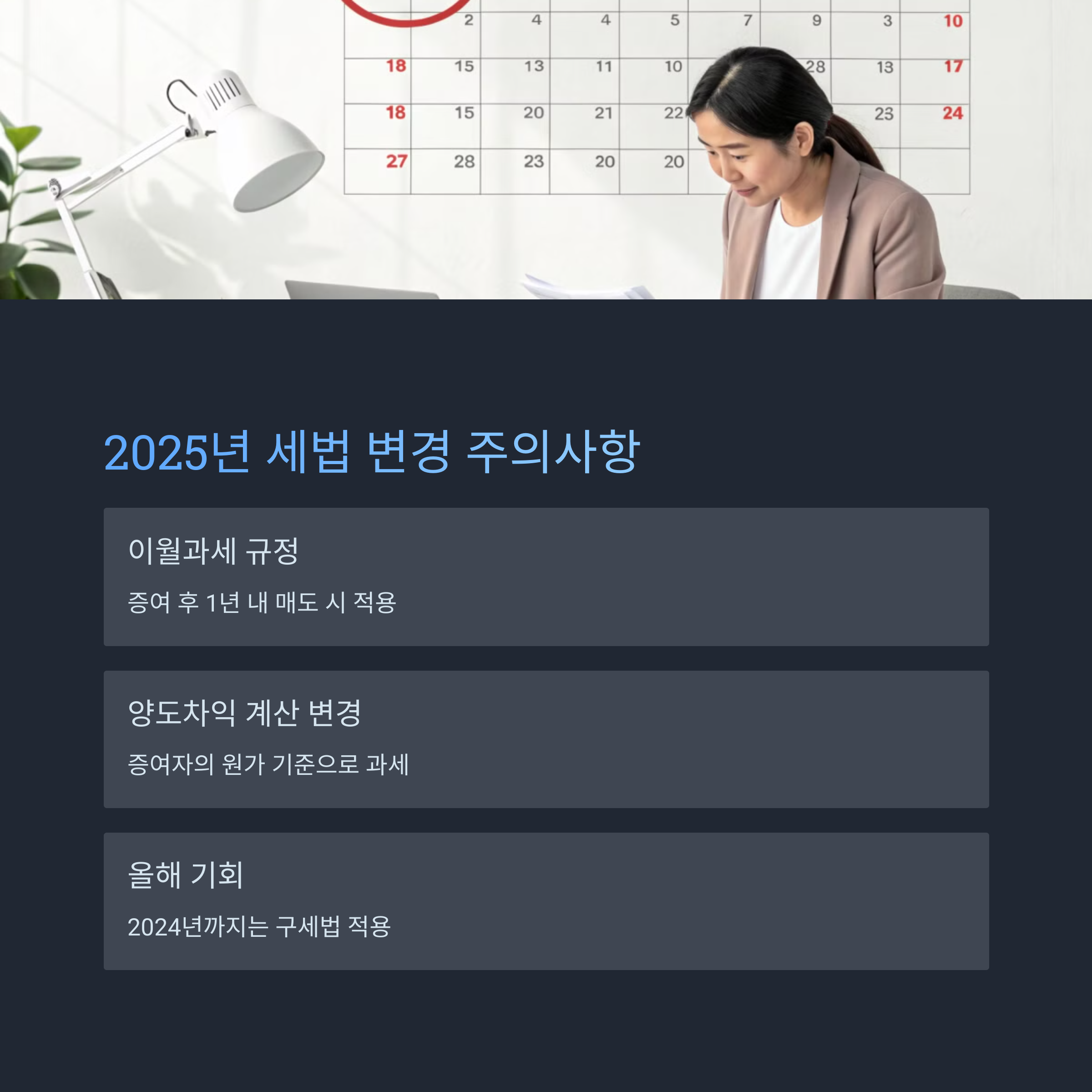 2025년부터는 증여 후 1년 내 매도 시 불이익이 있기 때문에 최소 1년 이상 보유하는 것이 유리합니다. 장기 보유 전략이 절세에 더 효과적이에요.