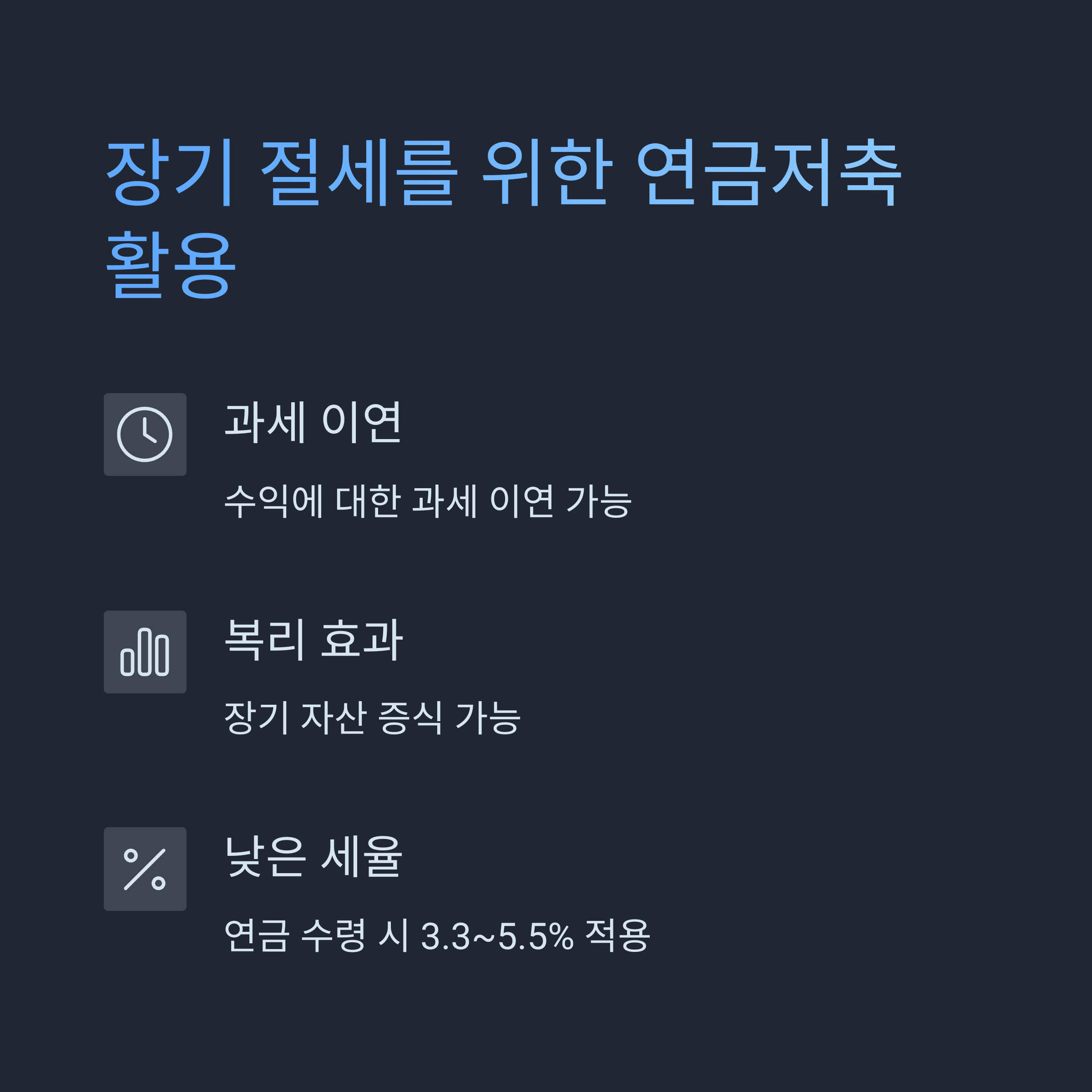 - 연금 수령 시 낮은 세율 적용 (3.3~5.5%)