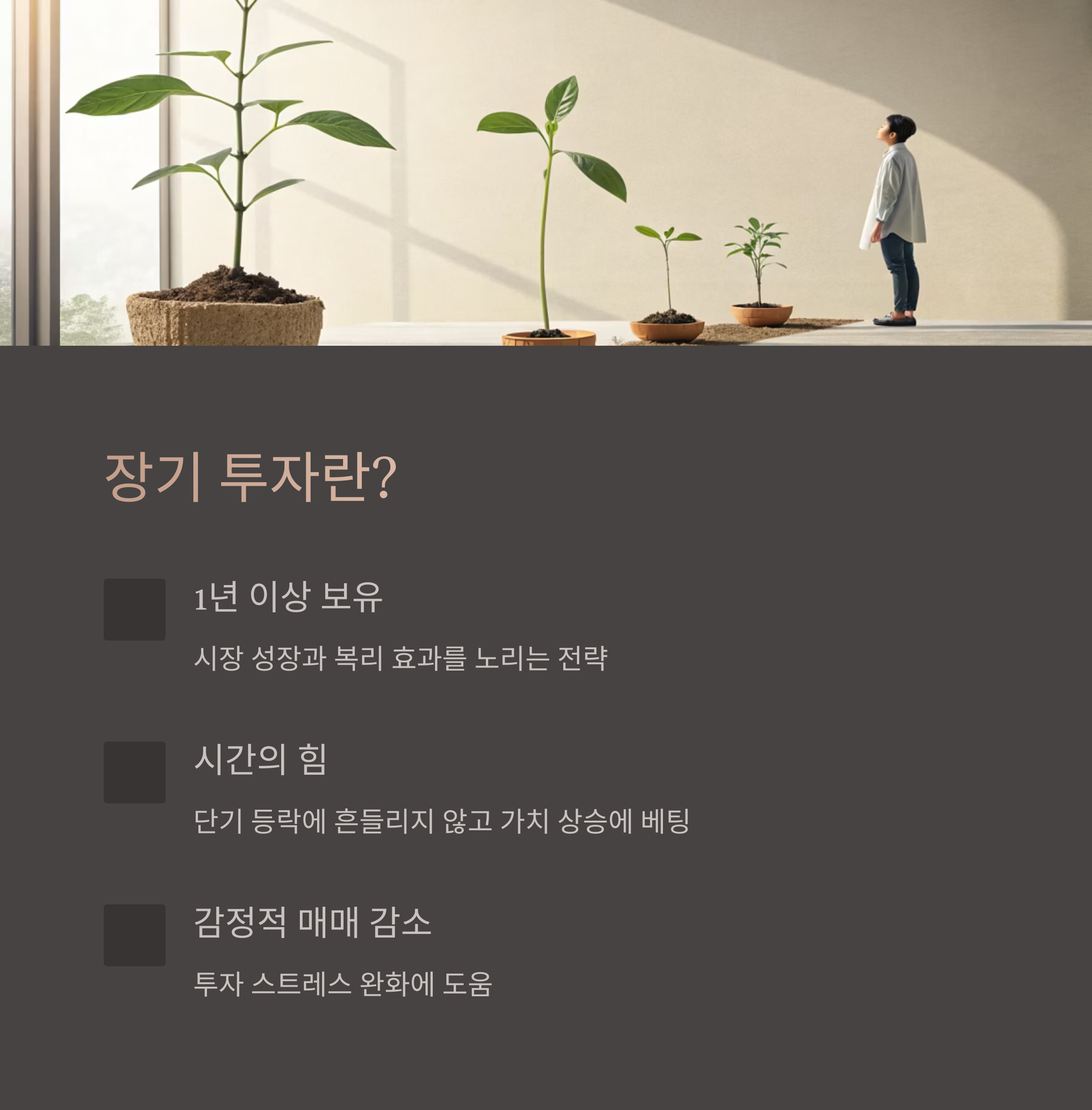 다만 저처럼 일과 병행하거나 시장을 매일 체크할 수 없는 분들에겐 장기 투자가 심리적 안정감과 꾸준한 수익 가능성을 줍니다.