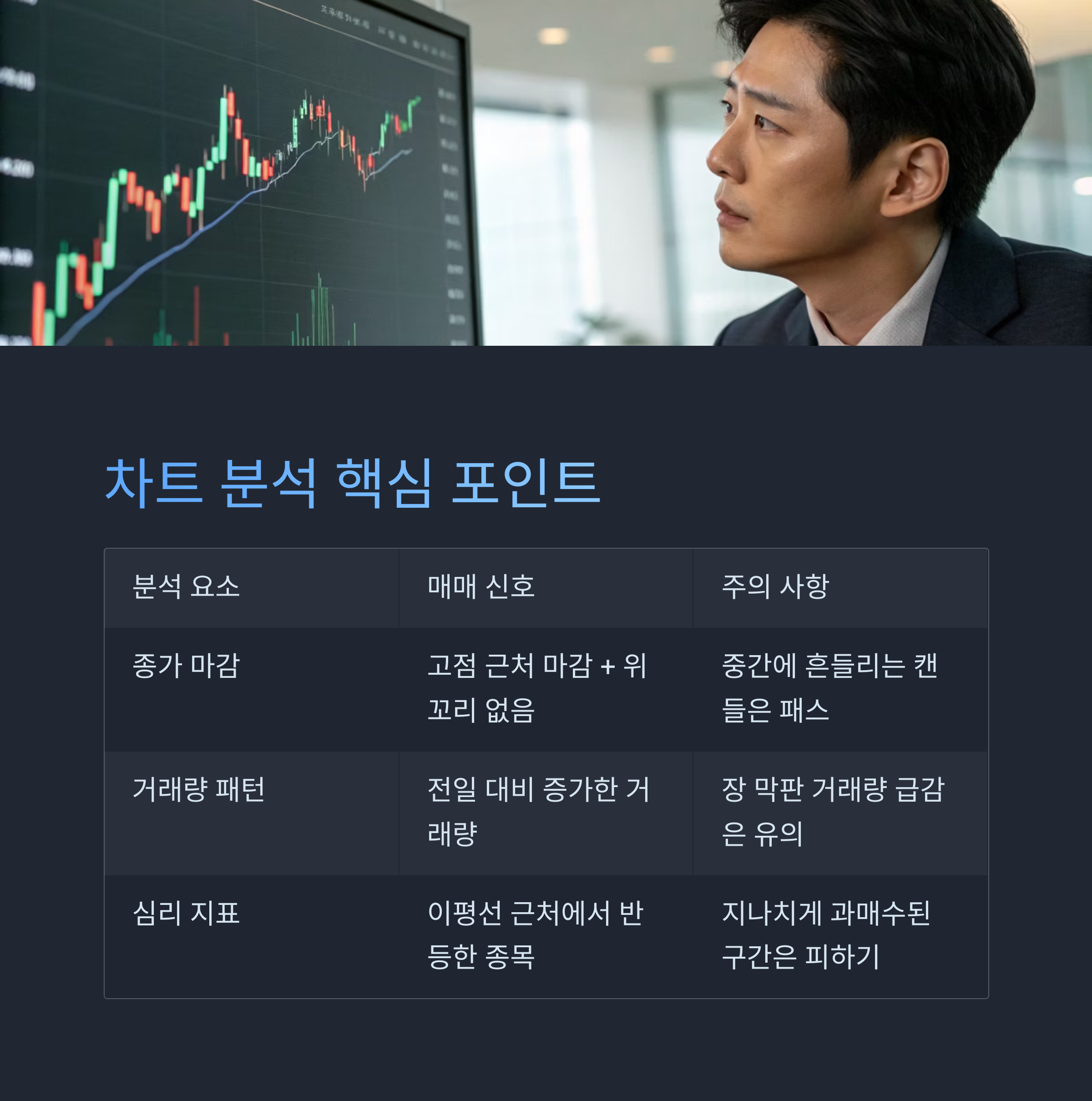 | 심리 지표 | 이평선 근처에서 반등한 종목 | 지나치게 과매수된 구간은 피하기 |