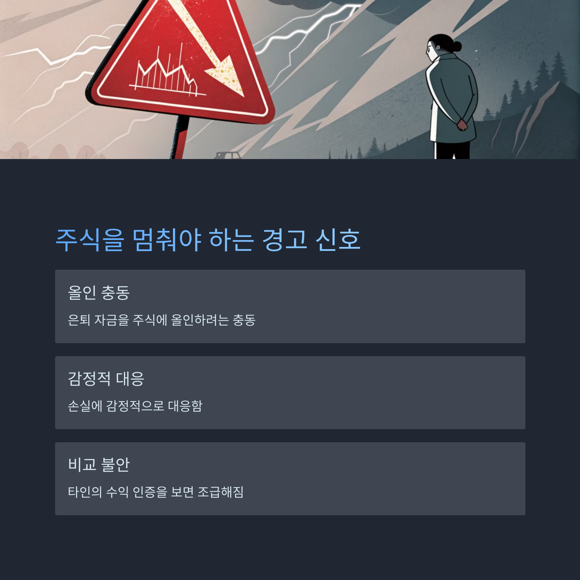 이 글을 통해 자신이 정말 주식을 해야 하는 사람인지, 혹은 잠시 멈춰야 하는 사람인지를 스스로 되돌아보는 계기가 되셨길 바랍니다.