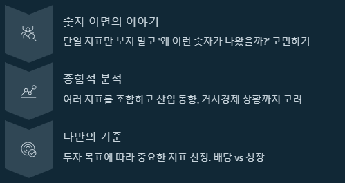 투자를 할 때 '나는 어떤 기업에 투자하고 싶은가?'라는 질문에 답할 수 있는 나만의 기준을 세워보세요. 안정적인 배당을 주는 기업을 선호하는지, 아니면 높은 성장 잠재력을 가진 기업에 투자하고 싶은지 등 목표에 따라 중요하게 봐야 할 지표들이 달라질 수 있습니다.